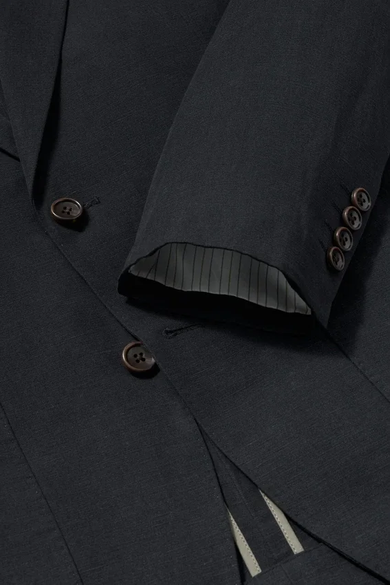 Tejido de la fábrica Duemilagori en Italia | Ligero, sin entretela | Corte holgado | Solapas en pico | 2 botones en la parte delantera | Doble abertura trasera | Puños con botones decorativos para facilitar el ajuste de las mangas | Interior parcialmente forrado en algodón ligero | Forro de las mangas