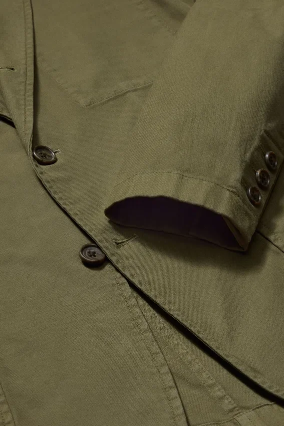 Solapa en V | Corte de tres botones y dos pliegues | Sin forro y Unconstructed | Bolsillos de parche en la cintura | Bolsillo interior | Botones funcionales en los puños | Lazo interior para colgar