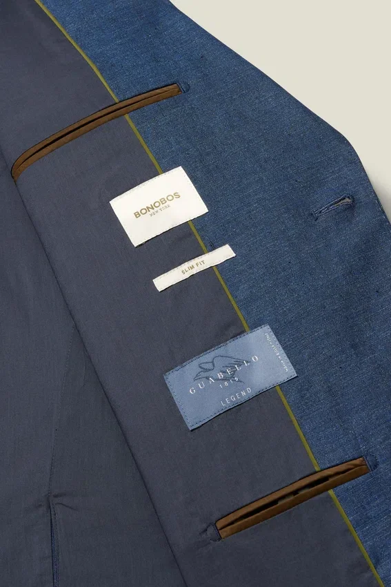 Tejido de Guabello | Construcción parcialmente entelada | Solapa en V | 2 botones en la parte delantera | Doble abertura trasera | Puños con botones no funcionales para facilitar el ajuste de las mangas | Interior totalmente forrado | Bordado floral personalizado de Bonobos en el interior | Estampado personalizado de Bonobos en el interior | El pin de la solapa es extraíble