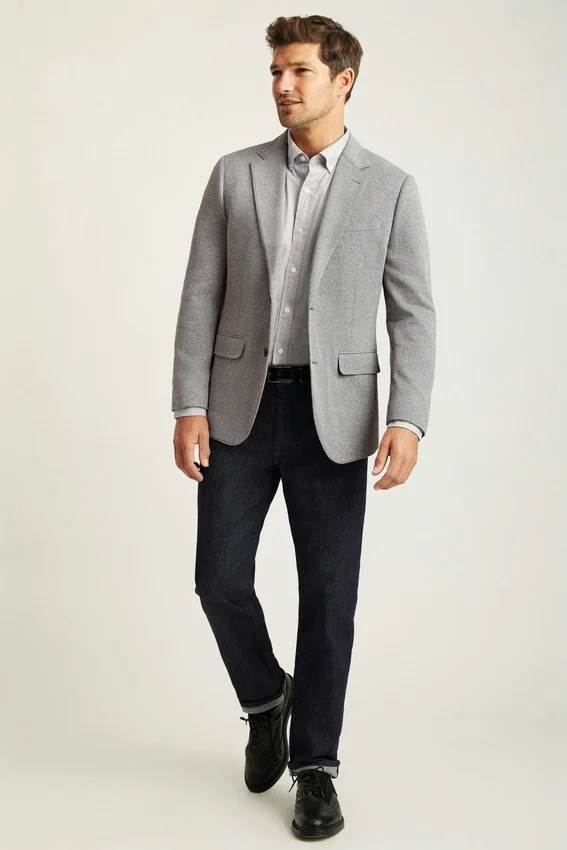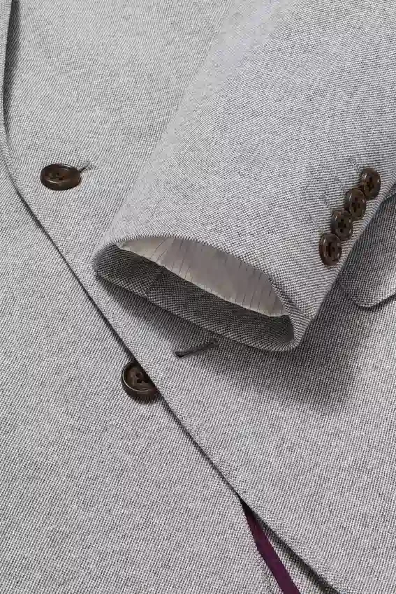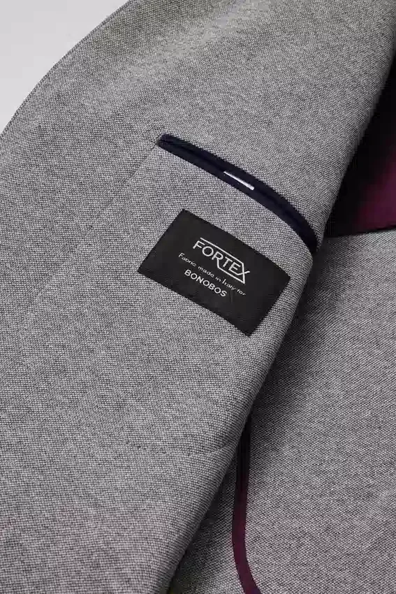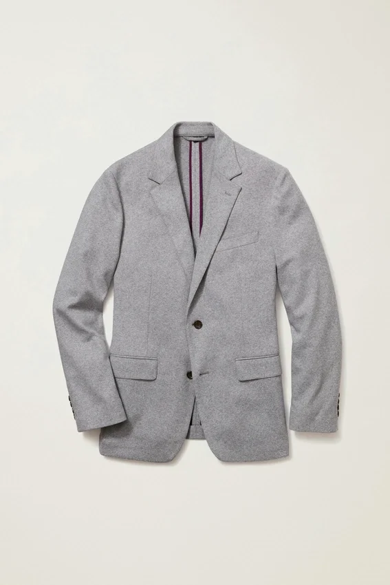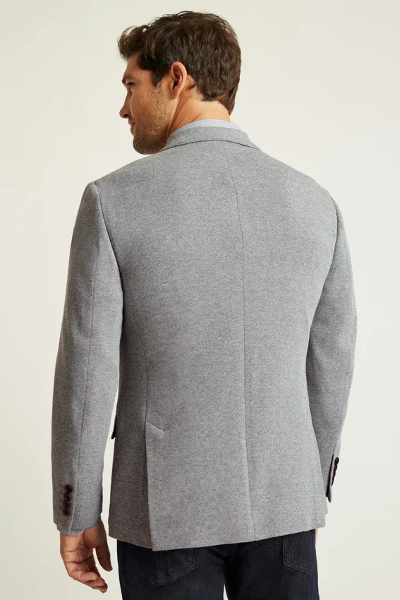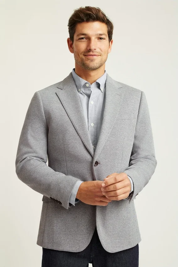 Blazer para todas las estaciones con forro mínimo, confeccionado en un tejido de punto melange de alta calidad de Lanificio Fortex | 8,25 cm de ancho en la solapa | Bolsillos con solapa | Dos botones, corte sencillo | Interior sin forro con refuerzo en los hombros y ribete en las costuras | Forro en las mangas | Botones decorativos en los puños | Doble abertura trasera | Confección ligera | Bolsillos interiores de ojal