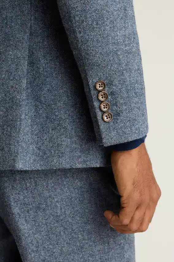 Tejido de Abraham Moon | Construcción totalmente entelada | Se puede llevar abrochado dos o tres veces para un look personalizable | Interior totalmente forrado | Forro en las mangas | Bolsillos interiores | Aberturas traseras