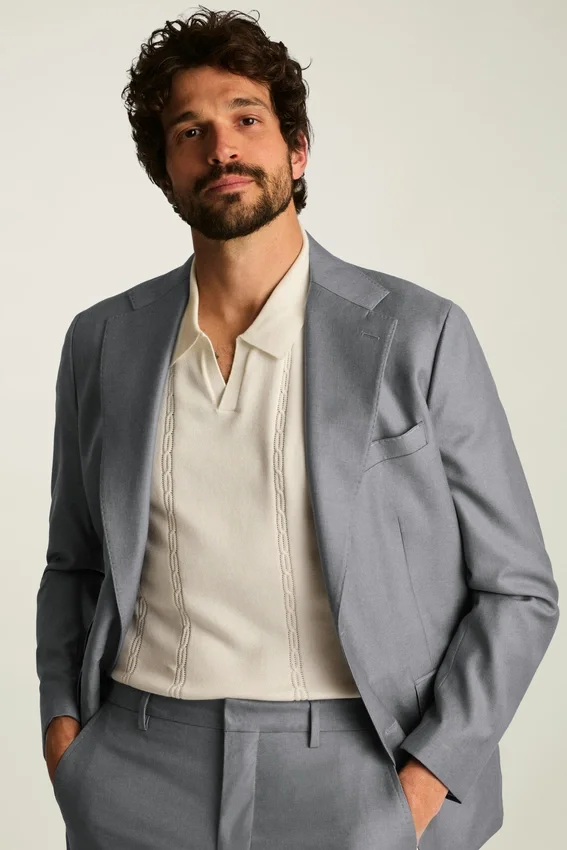 El modelo mide 1,88 m y lleva una talla 40R en corte Slim Fit