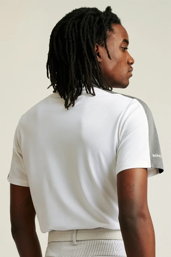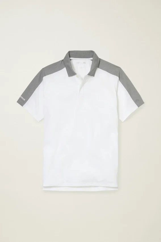 Tejido piqué ligero con protección UPF | Absorbe la humedad | Secado rápido | Funciones antiolor | Paneles contrastantes en bloques de color en los hombros | Ribete en espiga en el cuello de punto | Tapeta oculta en el centro delantero.
