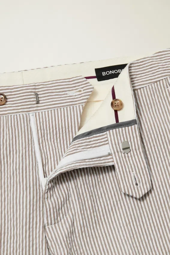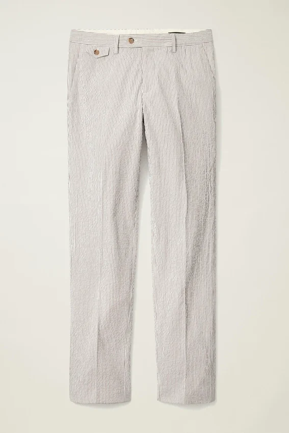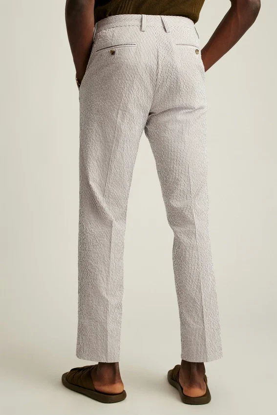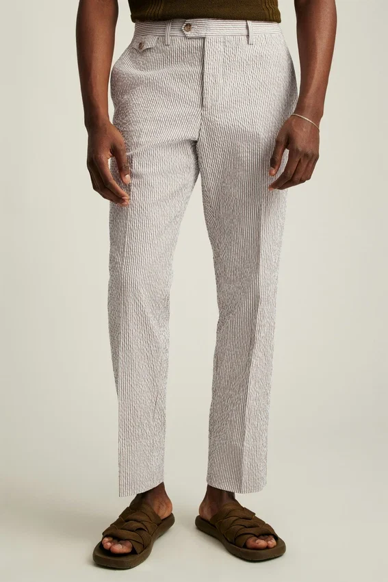 Un pantalón de vestir de algodón de seersucker ligero, listo para añadir encanto a cualquier evento en clima cálido.