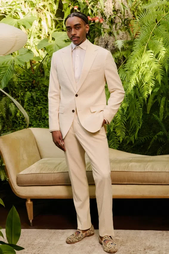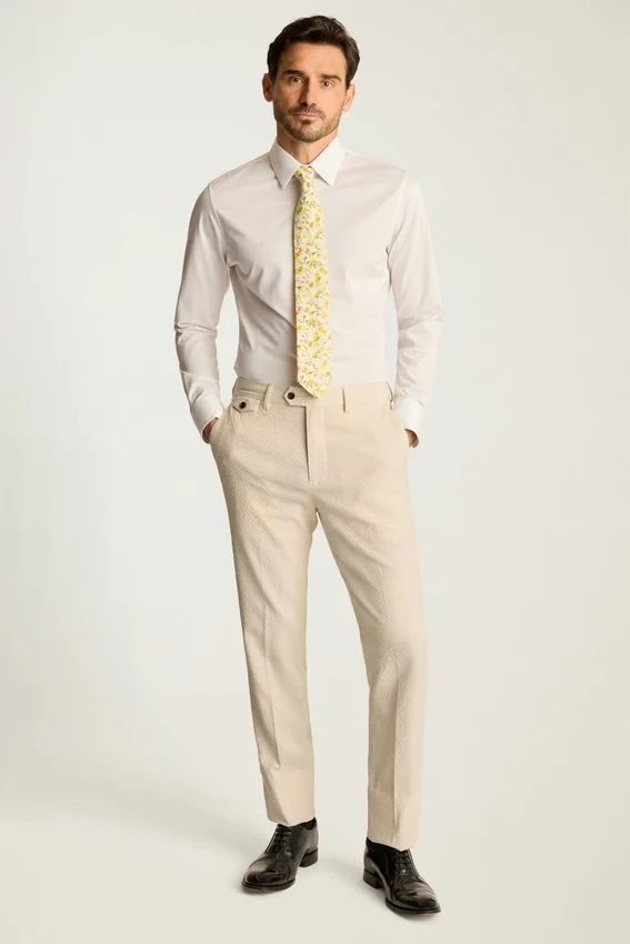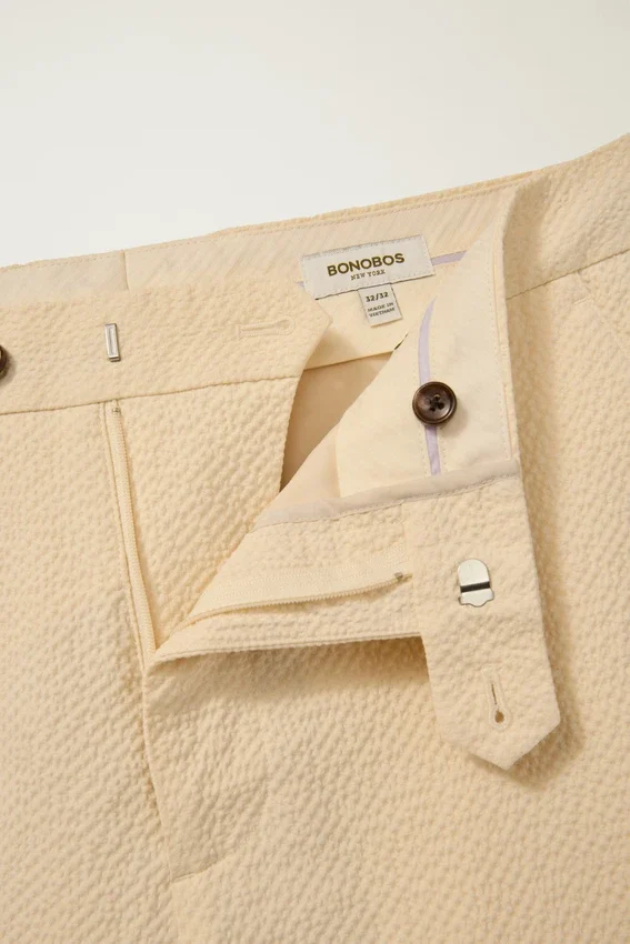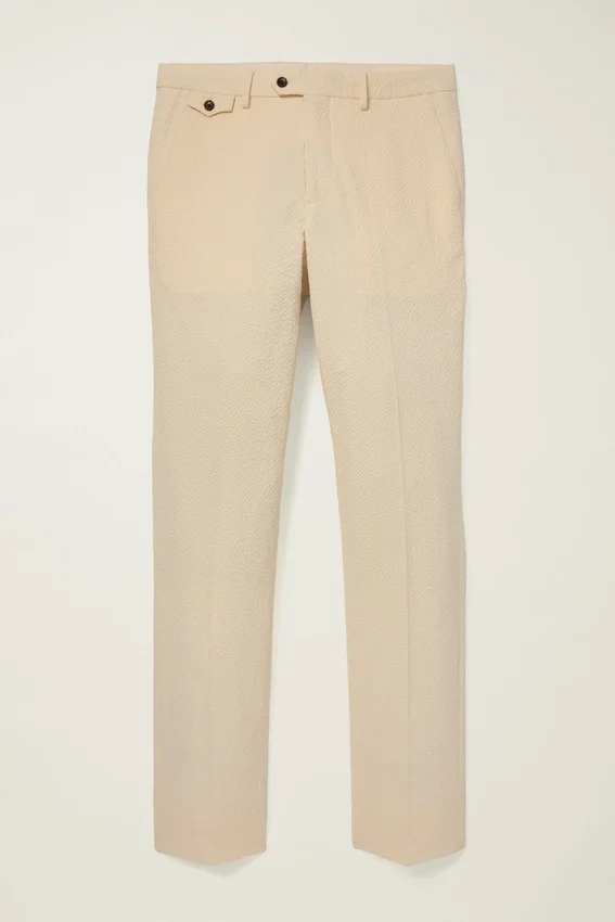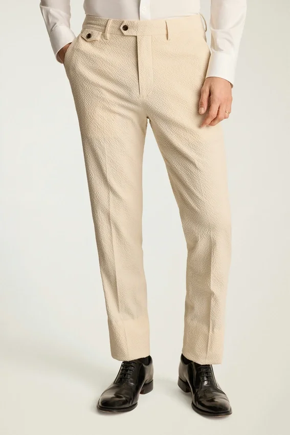 Un pantalón de vestir de algodón de seersucker ligero, listo para añadir encanto a cualquier evento en clima cálido.