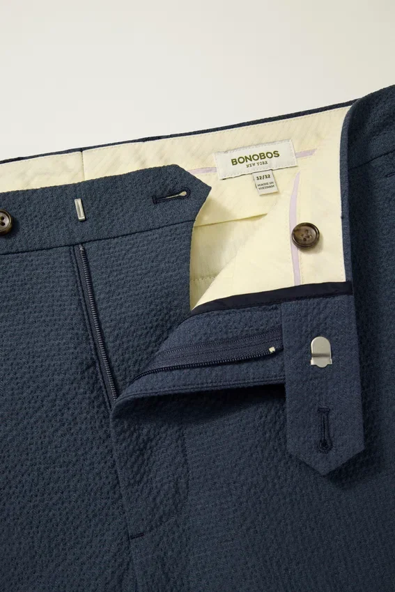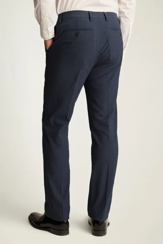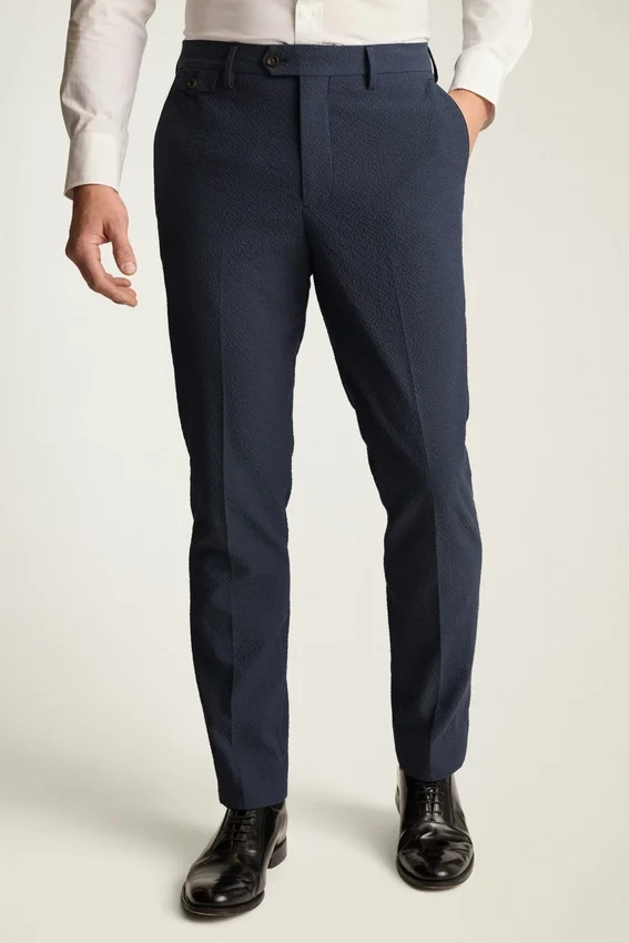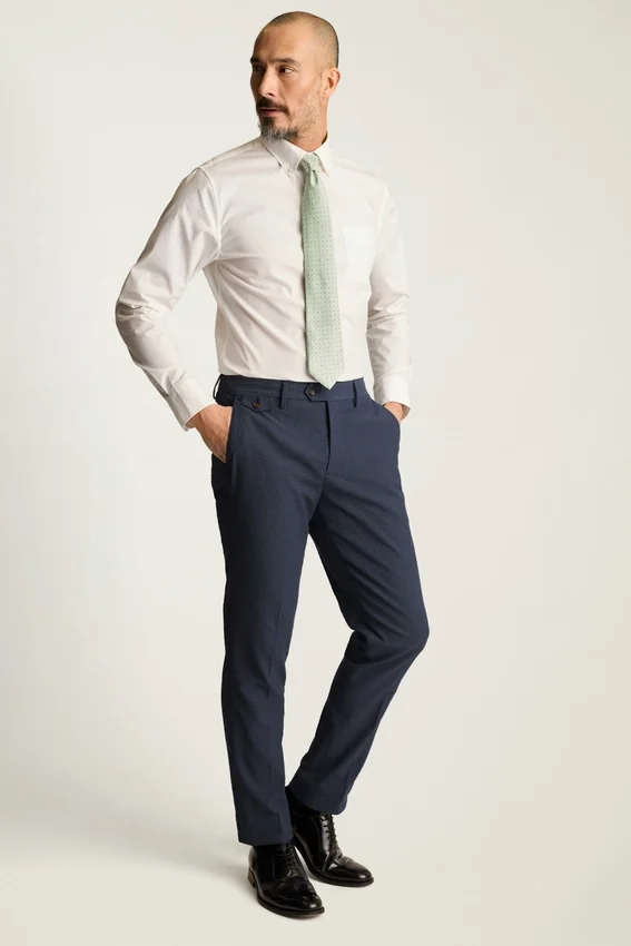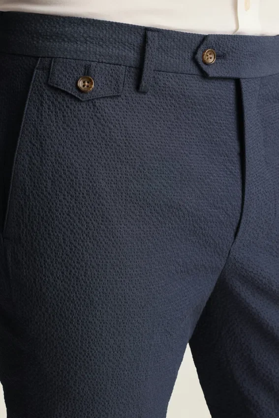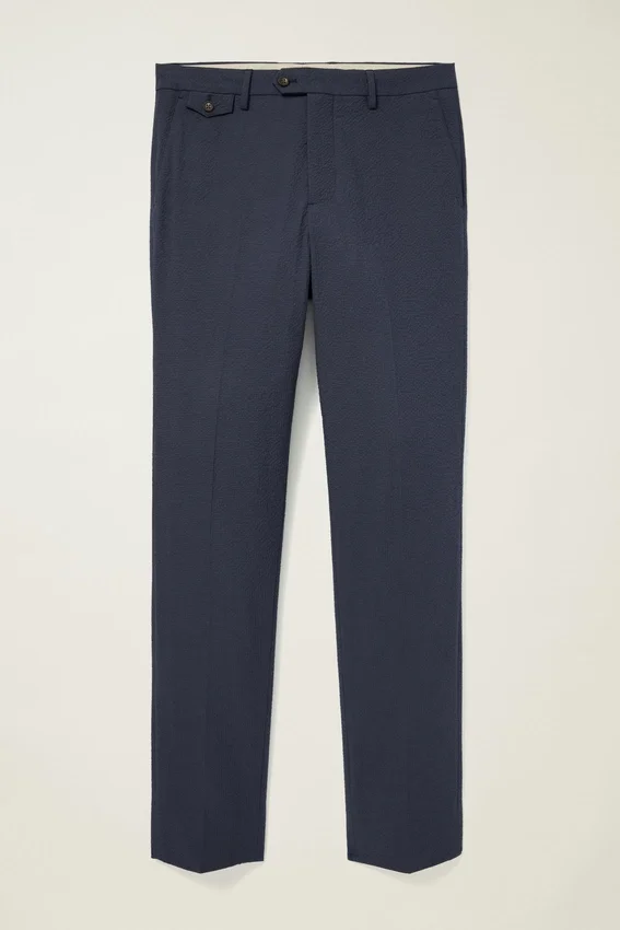 Un pantalón de vestir de algodón de seersucker ligero, listo para añadir encanto a cualquier evento en clima cálido.