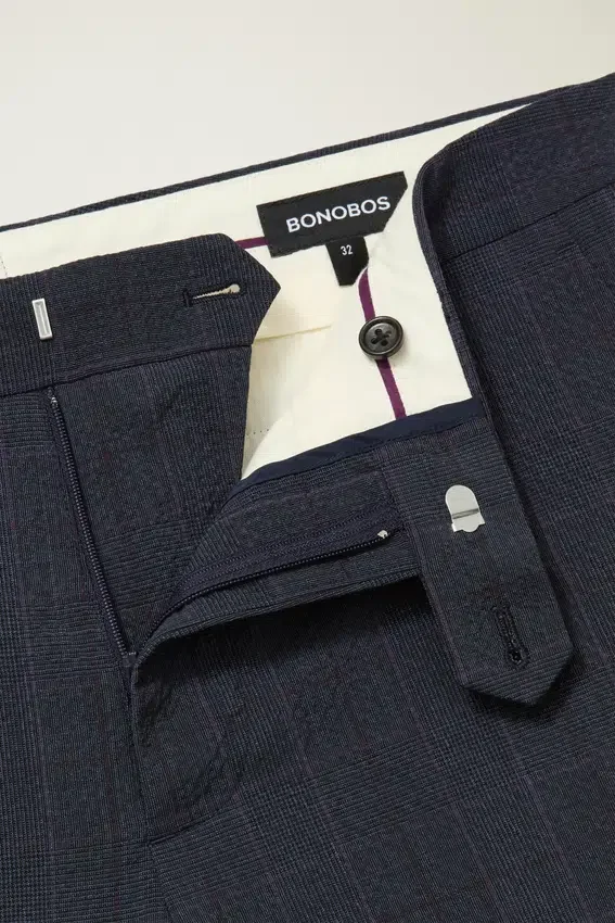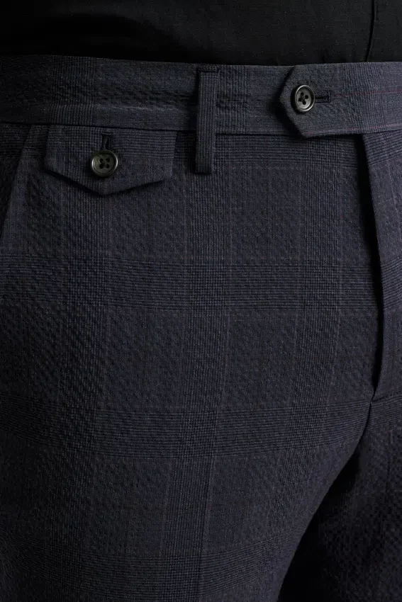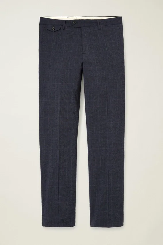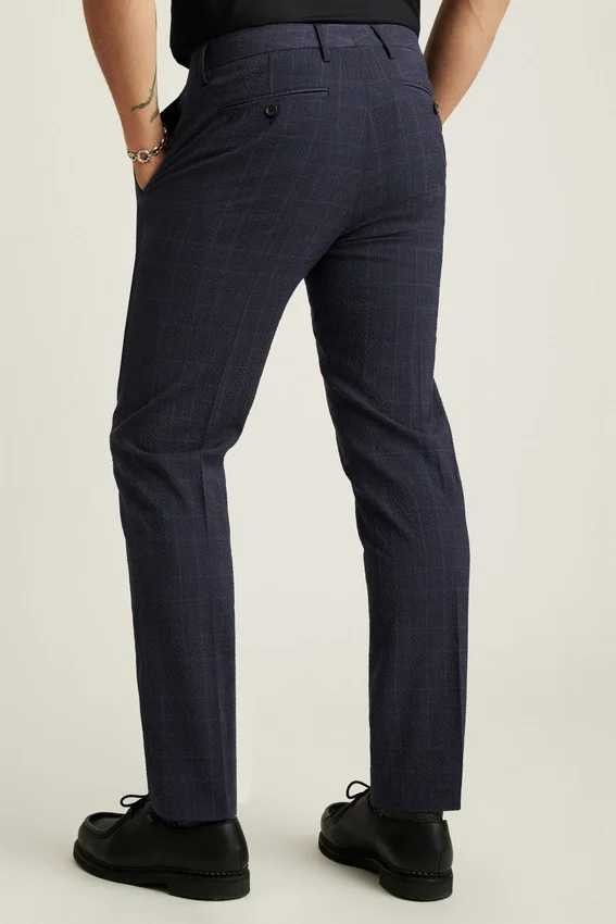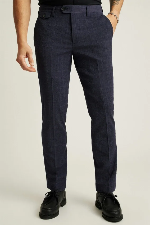 Un pantalón de vestir de algodón de seersucker ligero, listo para añadir encanto a cualquier evento en clima cálido.
