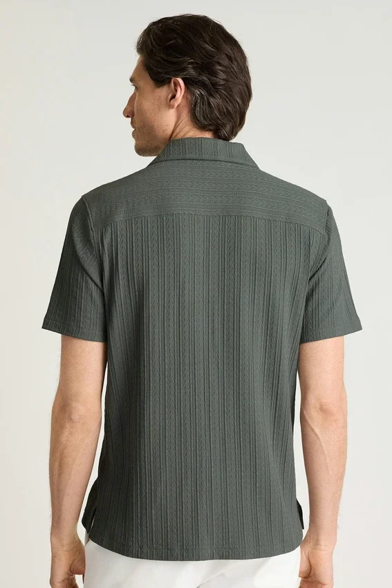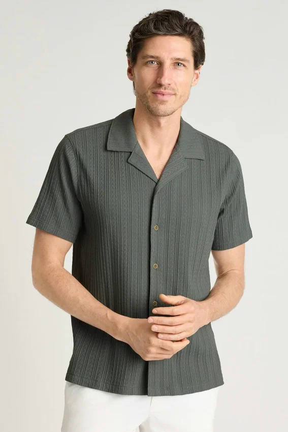 Tejido suave de mezcla de algodón | Rayas verticales texturizadas | Cierre con botones | Se puede llevar cerrada como camisa o abierta como prenda para combinar