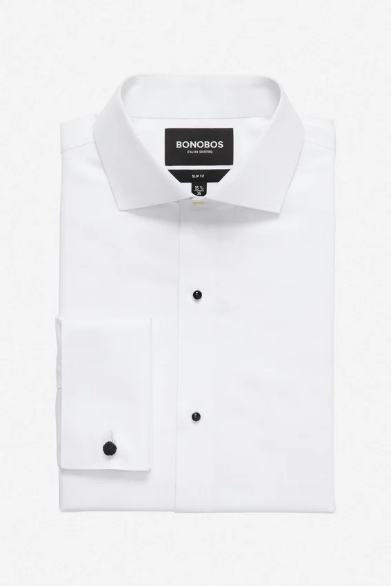 La camisa de esmoquin está disponible en blanco clásico, negro y también en una variedad de estampados y colores únicos. 100 % algodón, botones de nácar, pliegues y puños franceses.