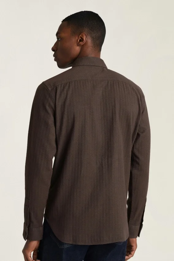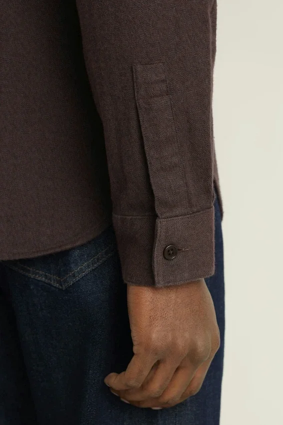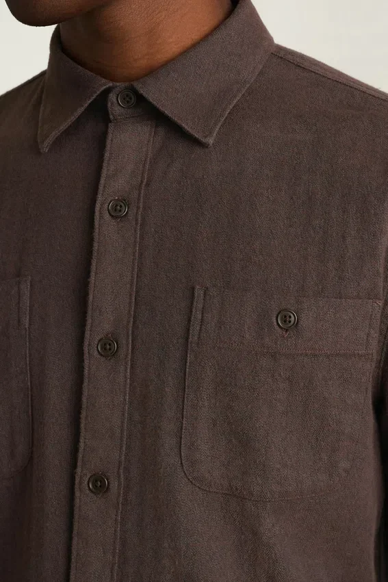 Tejido de franela elástica de tacto suave | Dos bolsillos en el pecho | Tejido gris jaspeado en el canesú trasero interior y la tapeta de botones interior