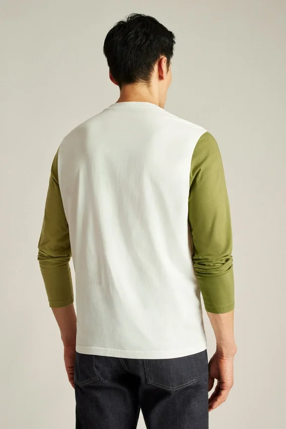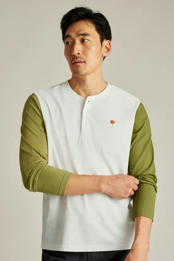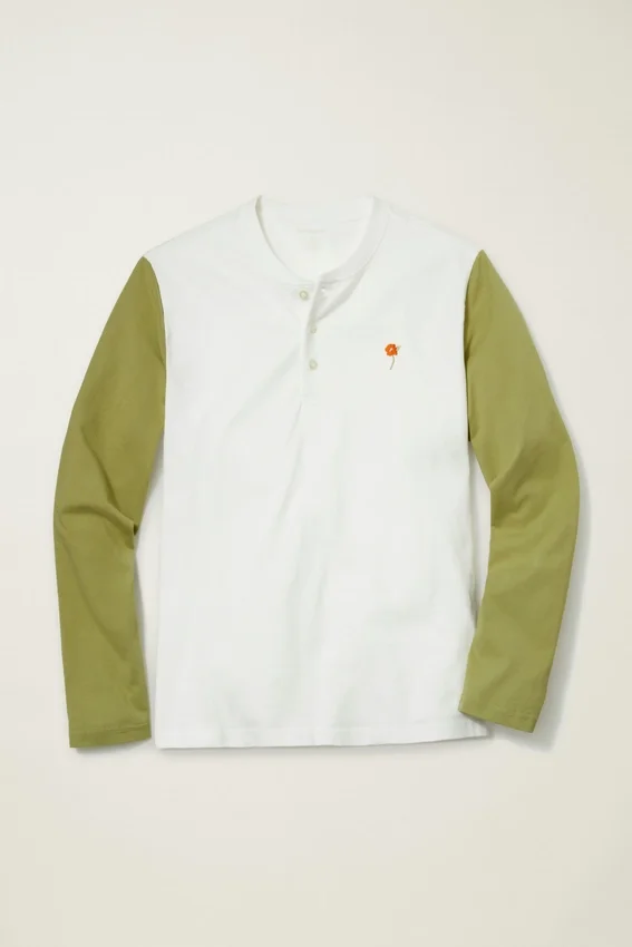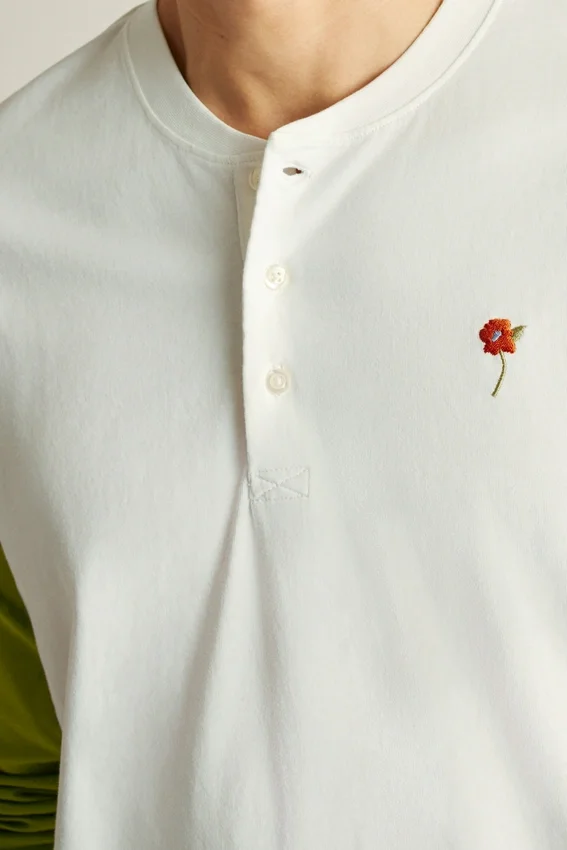 Tejido de jersey de peso medio en algodón suave y transpirable | Mangas en color de contraste | Cuello Henley con tapeta oculta | Bordado en el pecho izquierdo