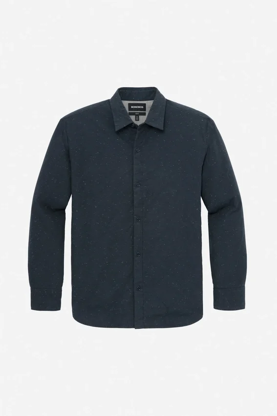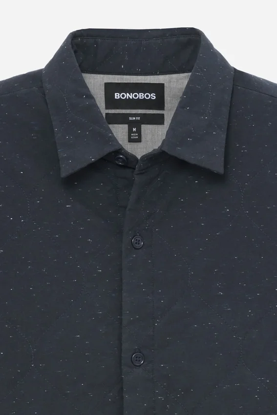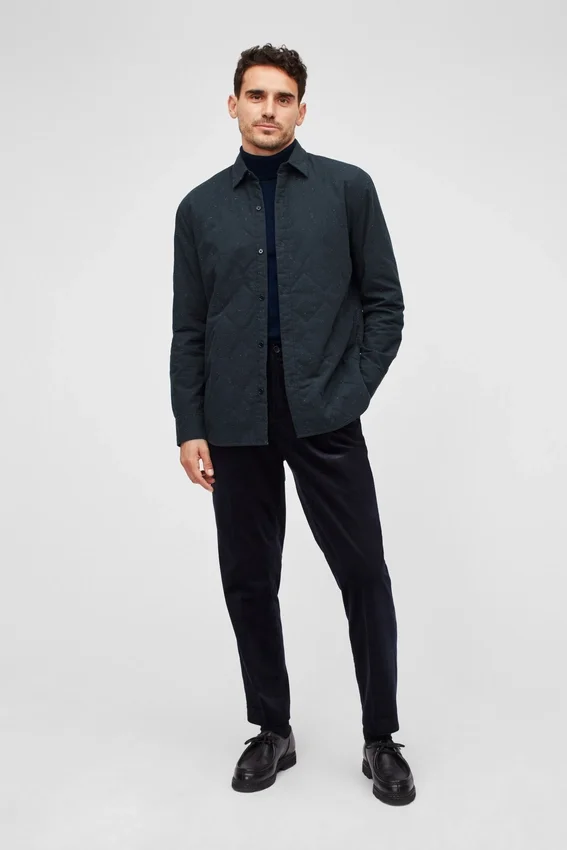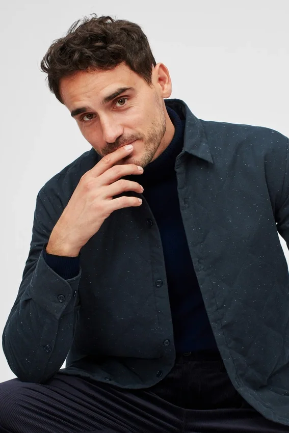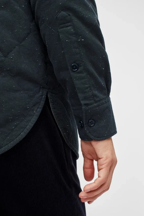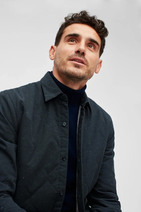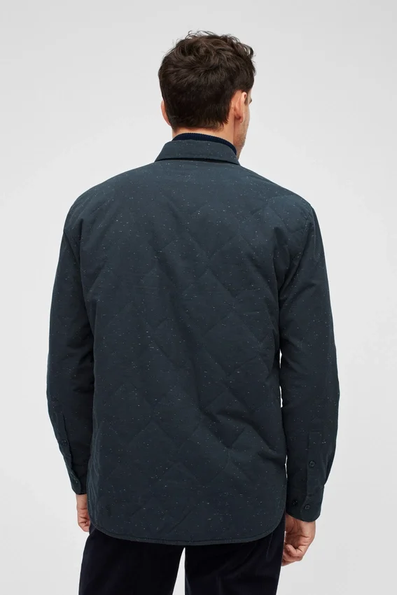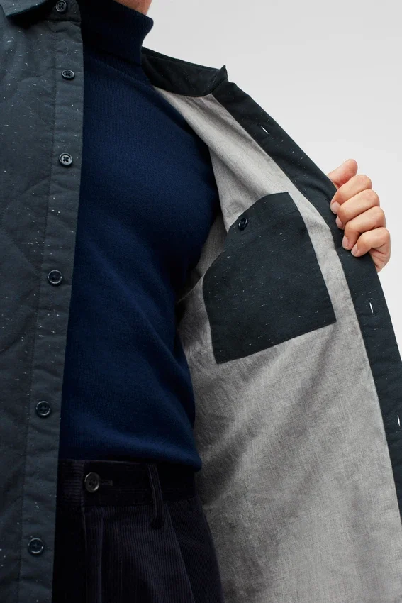 Chaqueta ligera | Exterior acolchado de tejido Donegal | Interior gris suave en contraste | Cuello en punta | Bolsillo interior en el pecho con cierre de botón del mismo tejido que el exterior