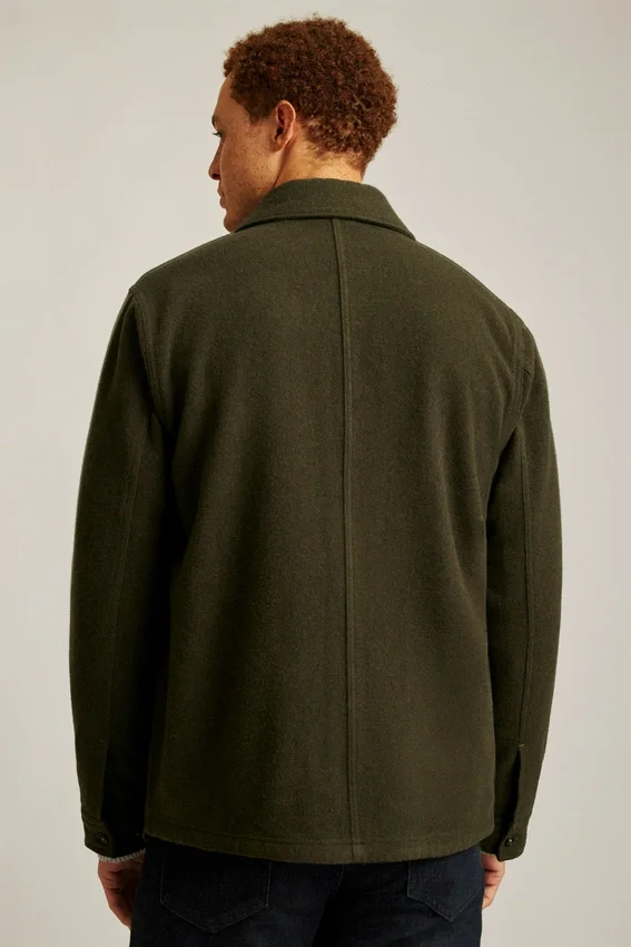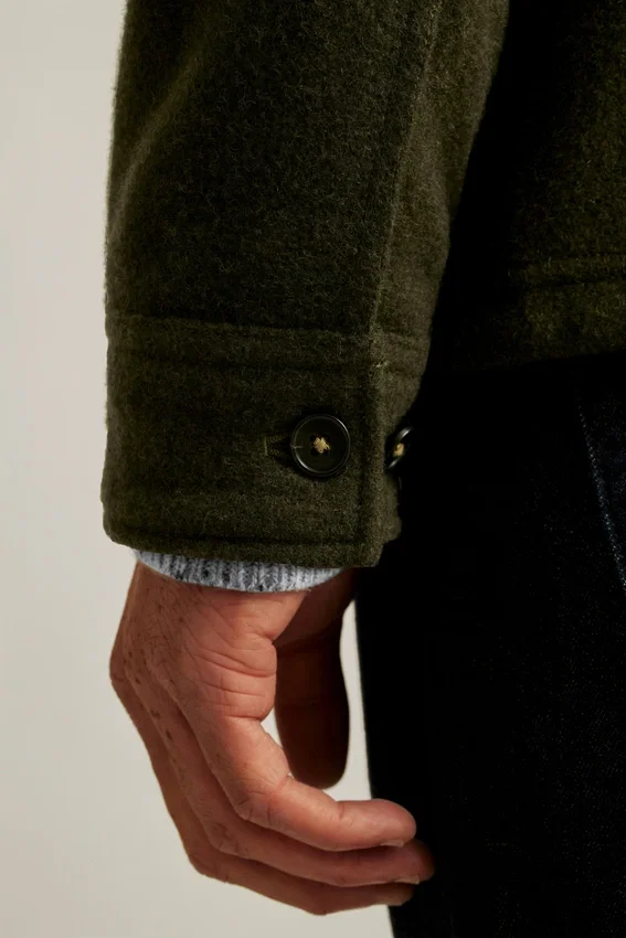 Tejido de mezcla de lana de Takisada | Bolsillos de parche en el pecho | Bolsillos de ribete en la cintura | Detalles en espiga cepillada a contraste en el interior | Doble botón en los puños | Cuerpo sin forro | Forro en las mangas
