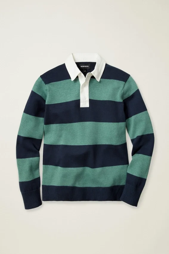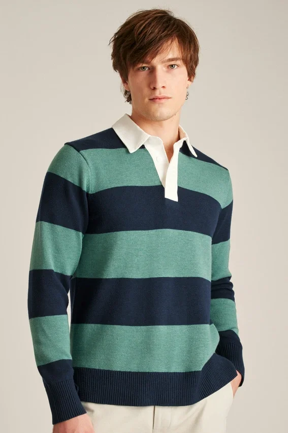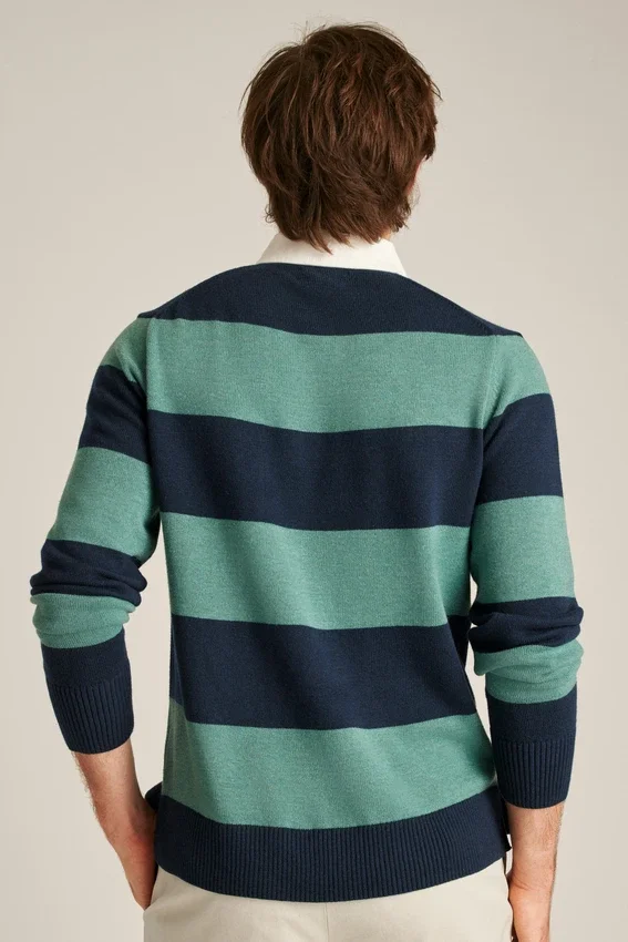 Hilo de algodón suave con un toque de lana para mayor calidez | Tejido con rayas clásicas de rugby teñidas en hilo | Cuello y tapeta de sarga