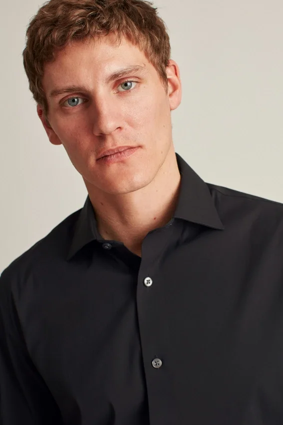 El modelo mide 1,88 m, tiene un contorno de pecho de 102 cm y lleva una talla 15,5 en corte Slim Fit
