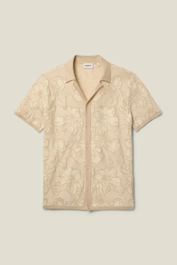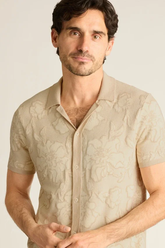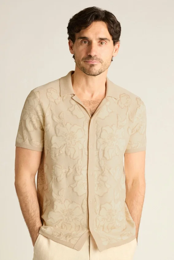 Hilo de algodón suave y transpirable con patrón de puntadas texturizadas en toda la prenda para un sofisticado estilo retro. Se puede llevar cerrado como una camisa o abierto como una prenda para combinar