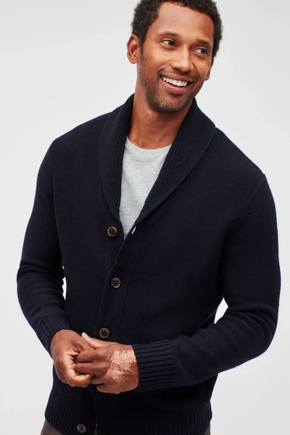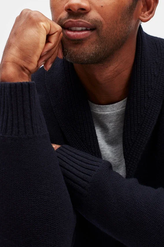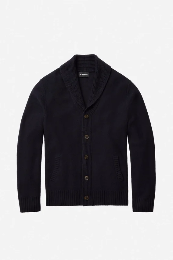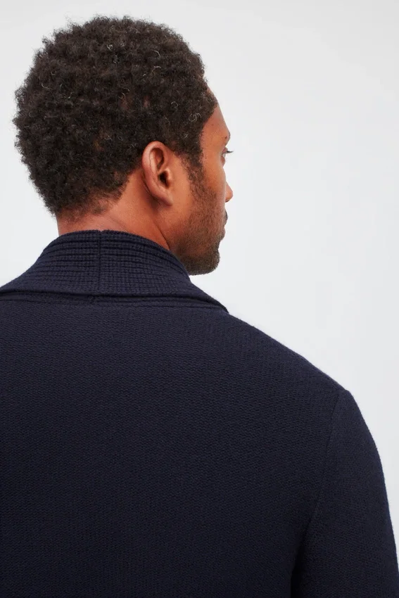 Lujosa y suave lana merino en un cárdigan con ribetes tradicionales para una prenda cómoda y acogedora