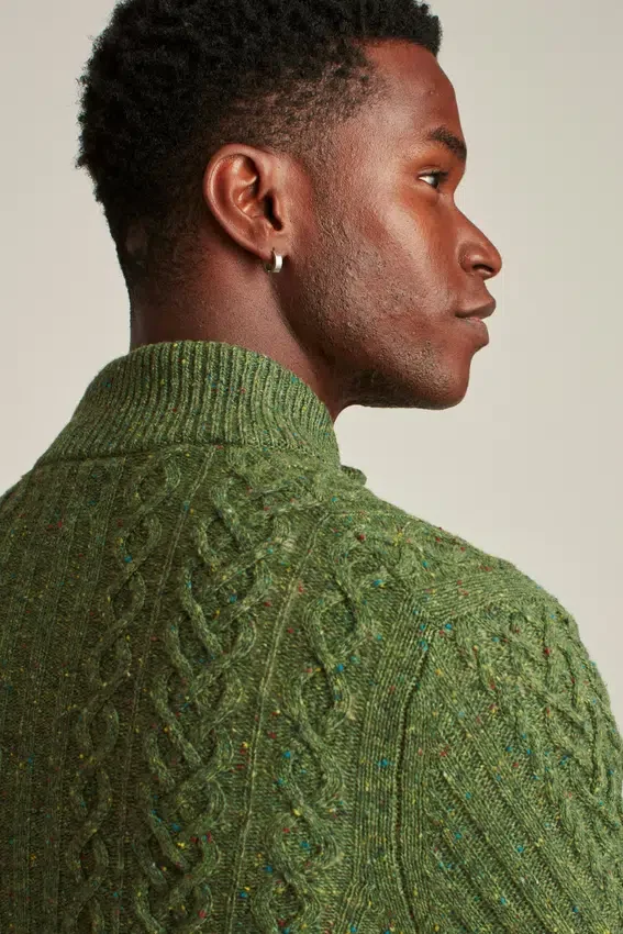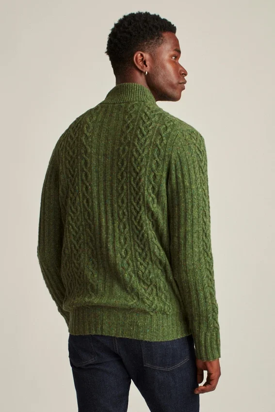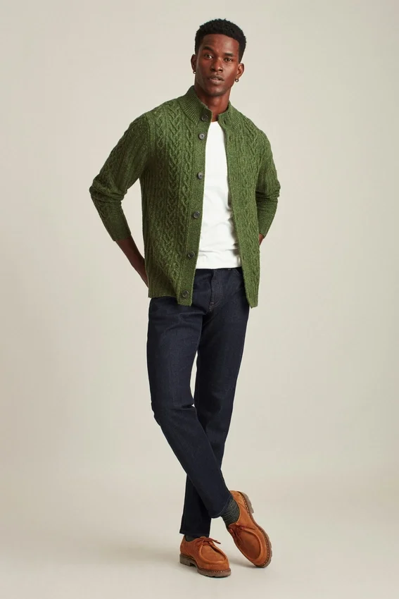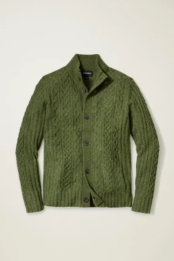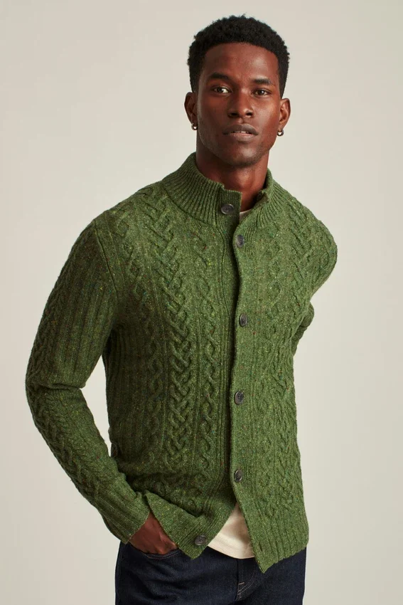 Cómodo cárdigan de cuello en forma de embudo confeccionado con hilo de mezcla de lana Donegal y punto trenzado en toda la prenda. Cierre con botones.