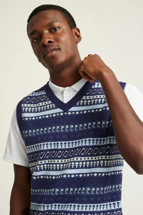 Suave mezcla de algodón y cachemira con diseño Fair Isle original inspirado en el Golf | Ribetes de punto acanalado | Color de contraste en el interior del cuello