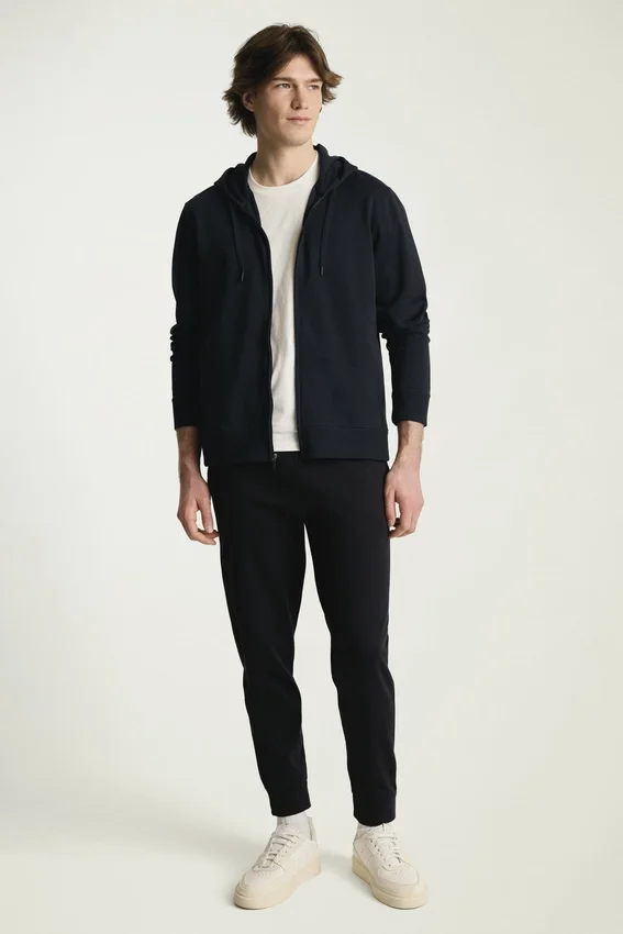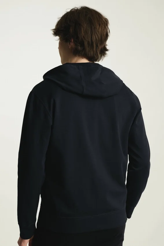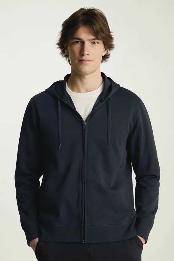 Tejido de peso medio, suave y liso | Absorbe la humedad | Capucha con cordones ajustables | Cierre con cremallera completa | Puños y dobladillo acanalados