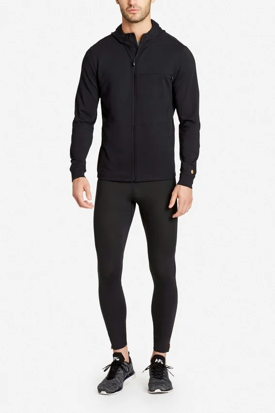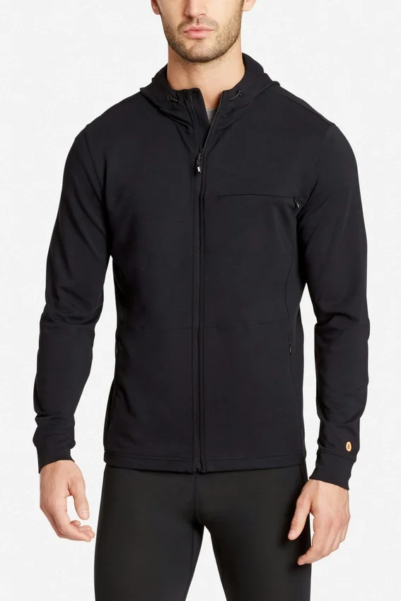 Tejido mezclado de Tencel supersuave para mantenerte cómodo. Capucha de 3 piezas con ajustadores elásticos. Dos bolsillos delanteros y un bolsillo en el pecho con ojal para los cables del celular. Bolsillo para celular en el bolsillo delantero. Cremallera con tiradores reflectantes. Lazo para colgar en la parte interior de la espalda. Logotipo y ribetes reflectantes.