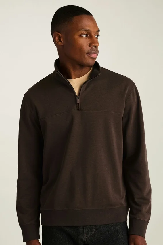 Tejido de peso medio, suave y liso | Absorbe la humedad | Cuello alto con cierre de media cremallera | Puños y dobladillo acanalados