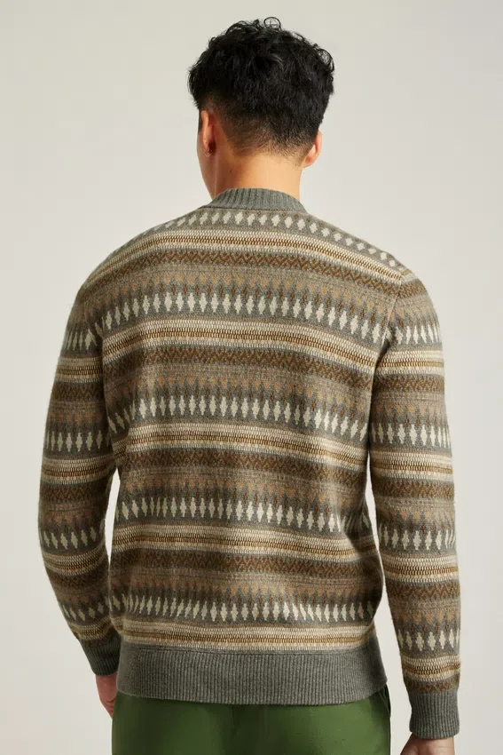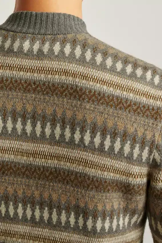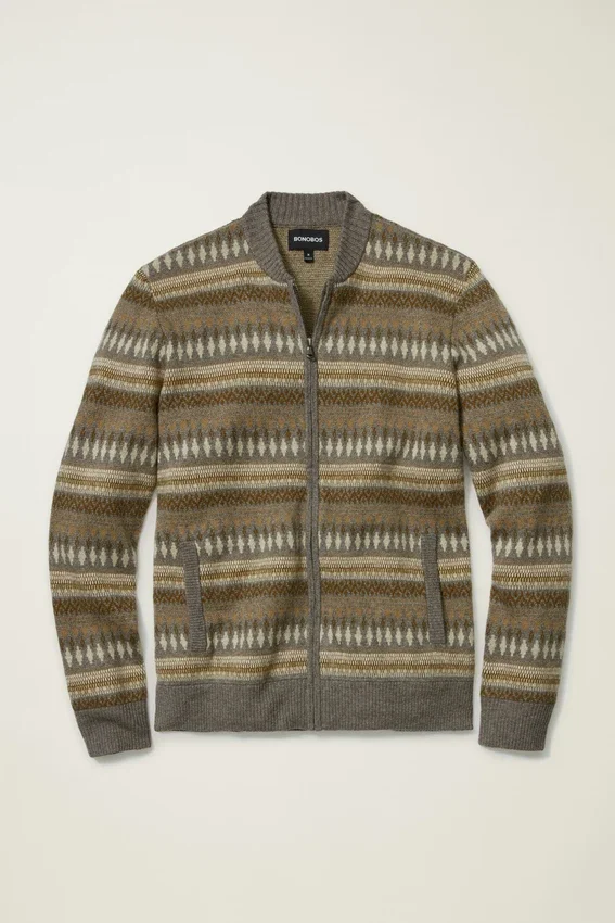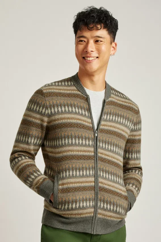 Hilo mezclado suave y acogedor con patrón Fair Isle de colores neutros | Ribetes acanalados | Cierre con cremallera completa | Bolsillos