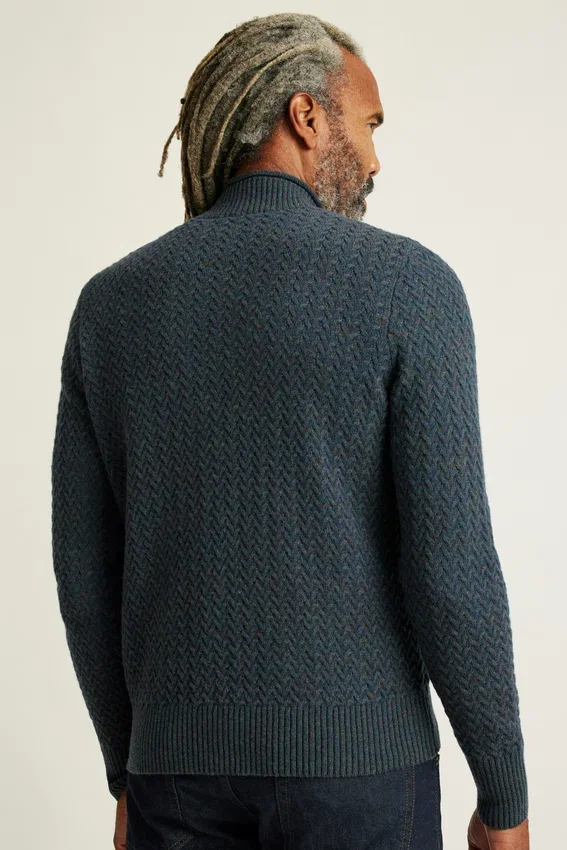 Mezcla de lana en color jaspeado multicolor | Punto trenzado en toda la prenda | Ribetes de punto elástico | Cuello alto con detalle de vuelta de jersey en el borde