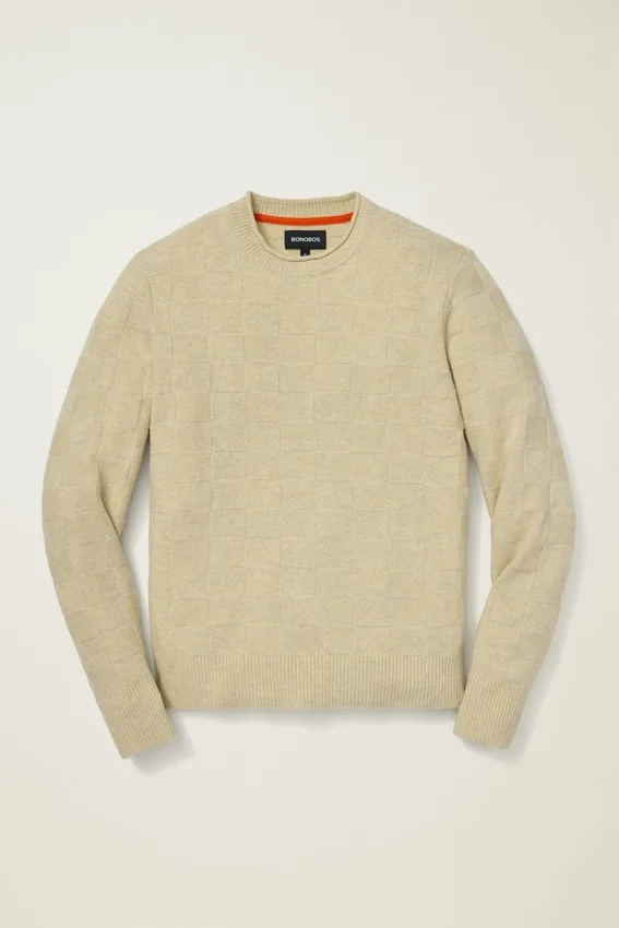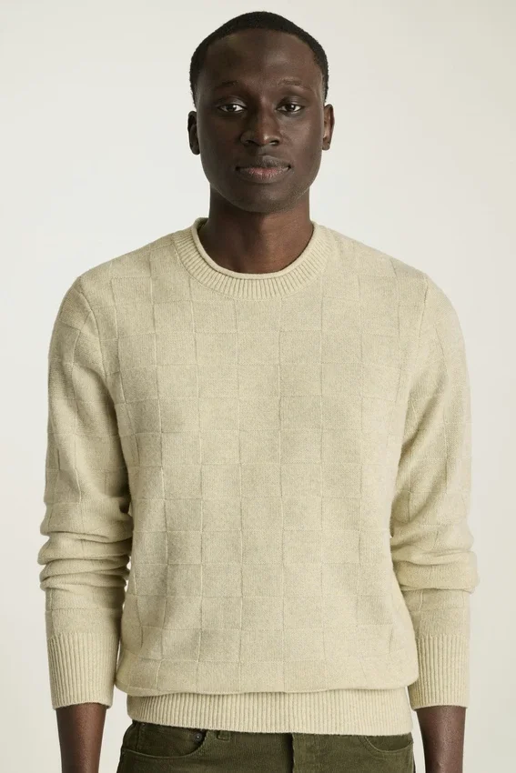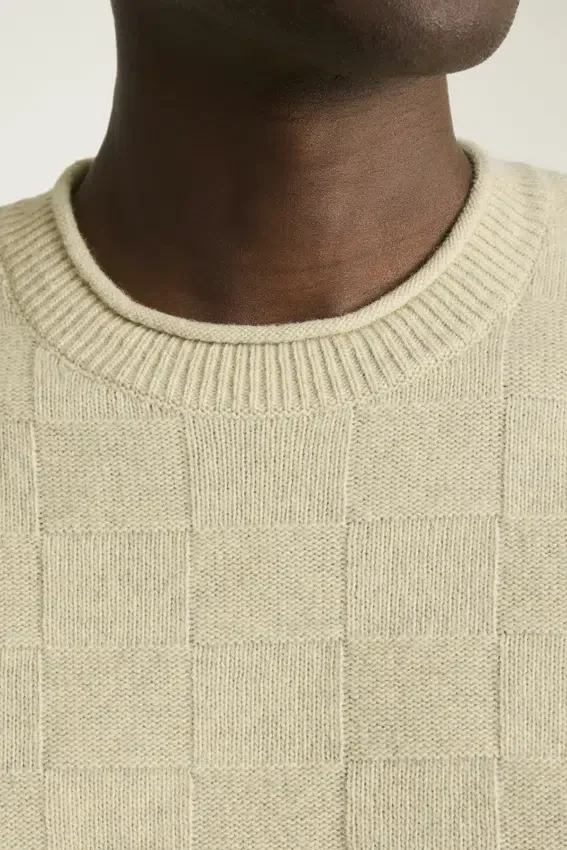 Hilo de mezcla de merino | Punto de textura cuadriculada en toda la prenda | Cuello redondo con borde enrollado | Ribetes acanalados
