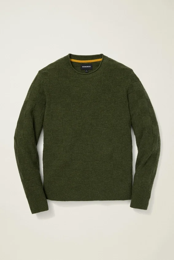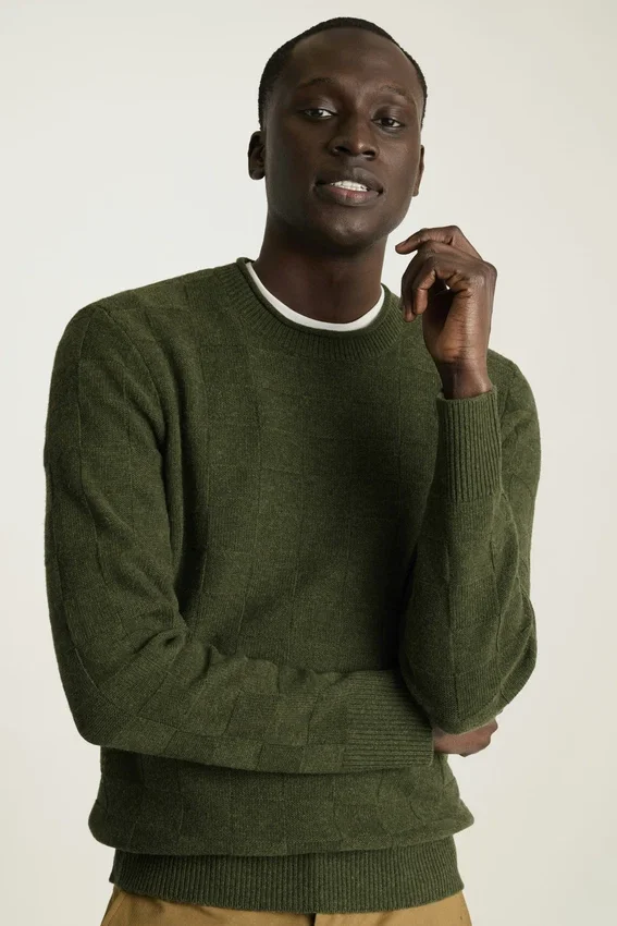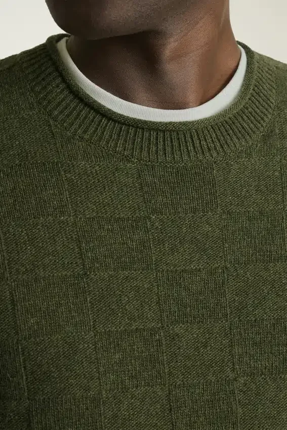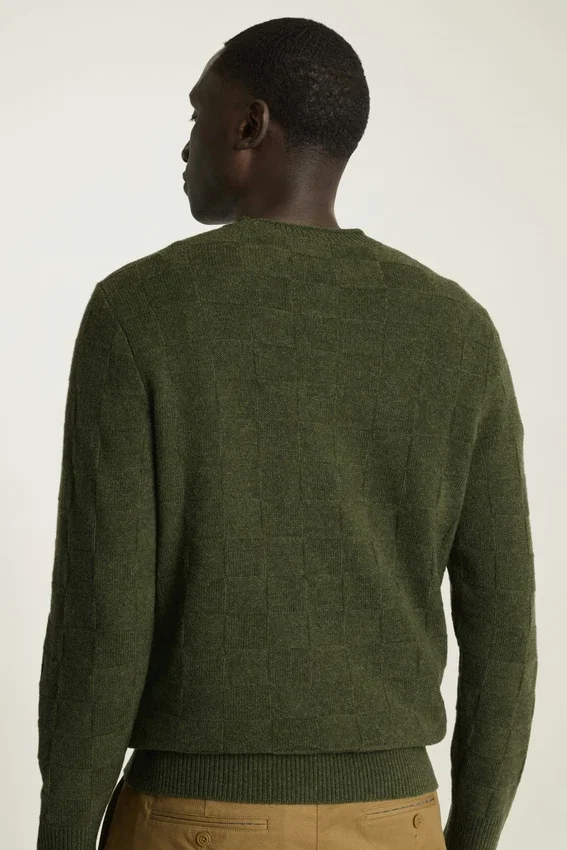 Hilo de mezcla de merino | Punto de textura cuadriculada en toda la prenda | Cuello redondo con borde enrollado | Ribetes acanalados