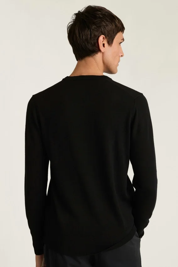 Lana merino ligera | Cuerpo de jersey | Cuello de canalé 1×1 más estrecho | Puños y dobladillo de canalé 1×1 más altos | Raya de color de contraste oculta en el ribete interior del cuello