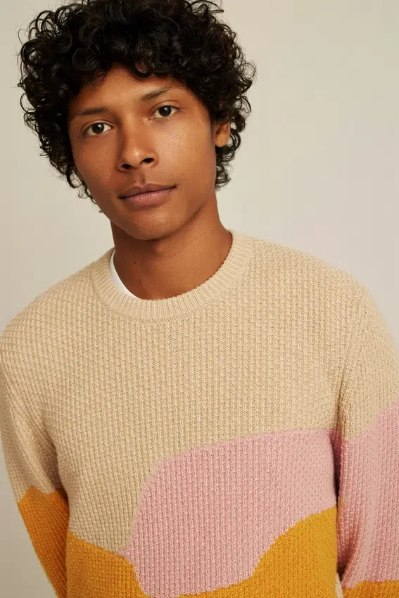 Hilo mezclado suave y acogedor con un diseño original de formas abstractas y punto texturado en toda la prenda