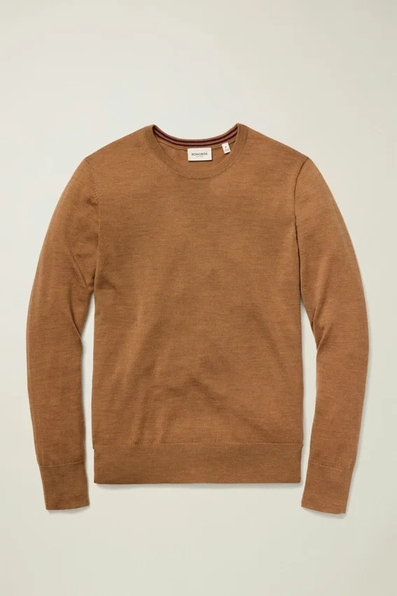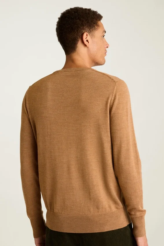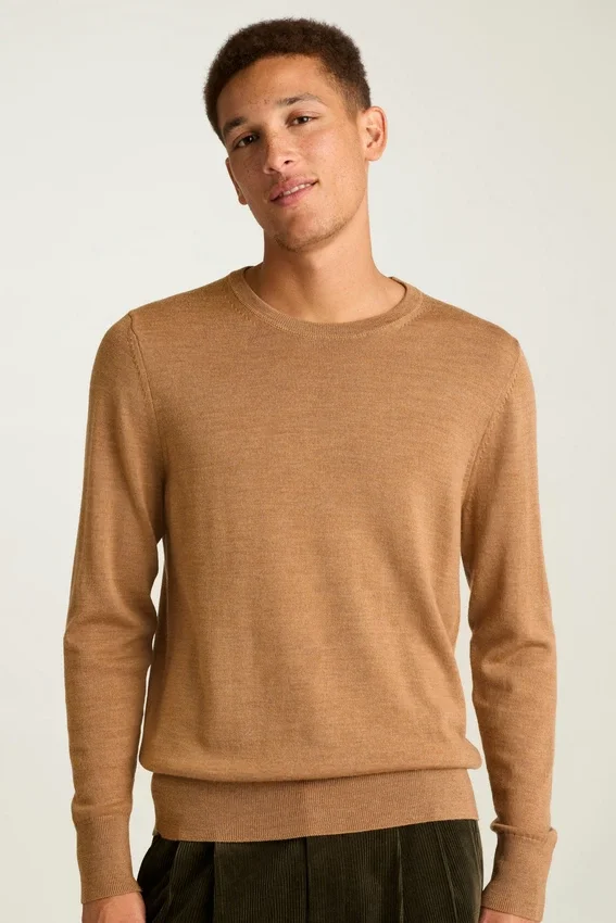 Lana merino ligera | Cuerpo de jersey | Cuello de punto elástico 1×1 más estrecho, cuello acanalado 1×1 más estrecho y refinado | Puños y dobladillo acanalados 1×1 más altos | Raya oculta en contraste en el ribete interior del cuello