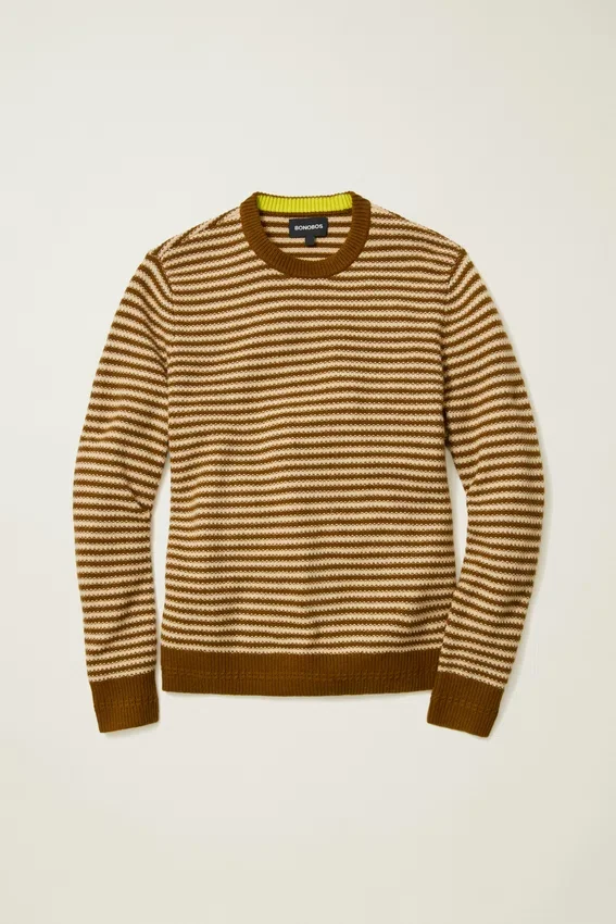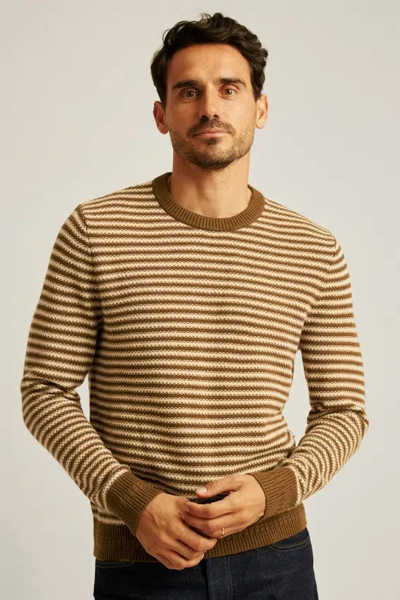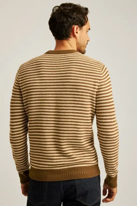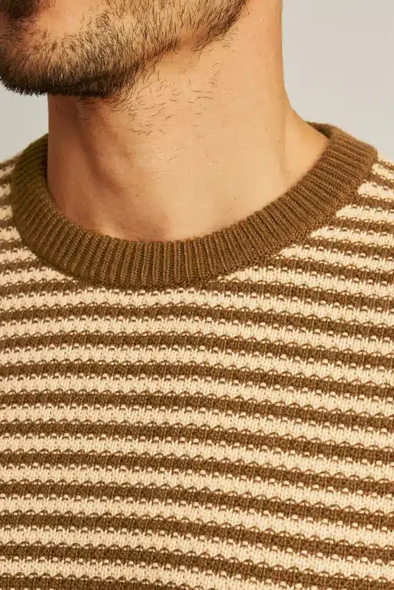 Hilo mezclado suave y acogedor con rayas teñidas en el hilo en punto texturado por toda la prenda | Los detalles cuidados incluyen punto trenzado en los puños y el dobladillo acanalado, y un color de contraste en la parte interior de la nuca