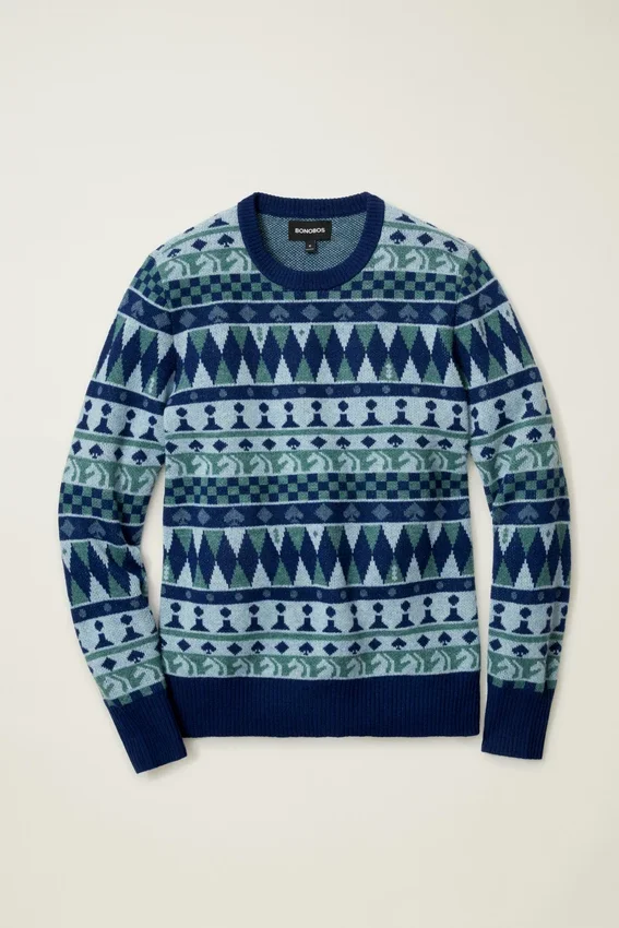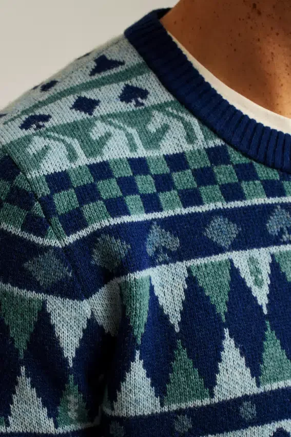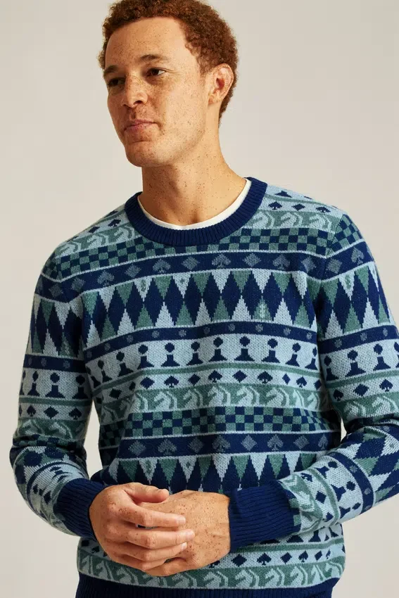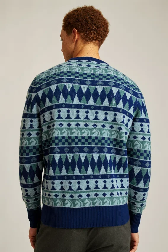 Hilo de mezcla de lana muy cómodo con diseño original que incorpora motivos de juegos de mesa en un patrón Fair Isle. Ribetes acanalados.