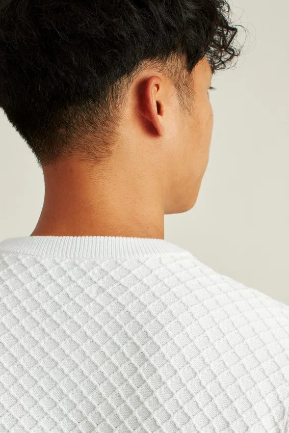 Mezcla de algodón refrescante | Punto texturizado en toda la prenda | Ribetes acanalados | Tapeta con botones | Raya oculta en contraste en el ribete interior del cuello