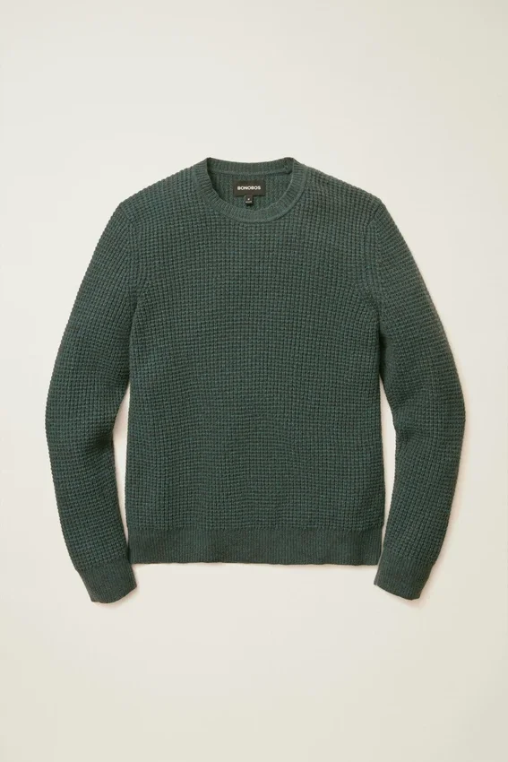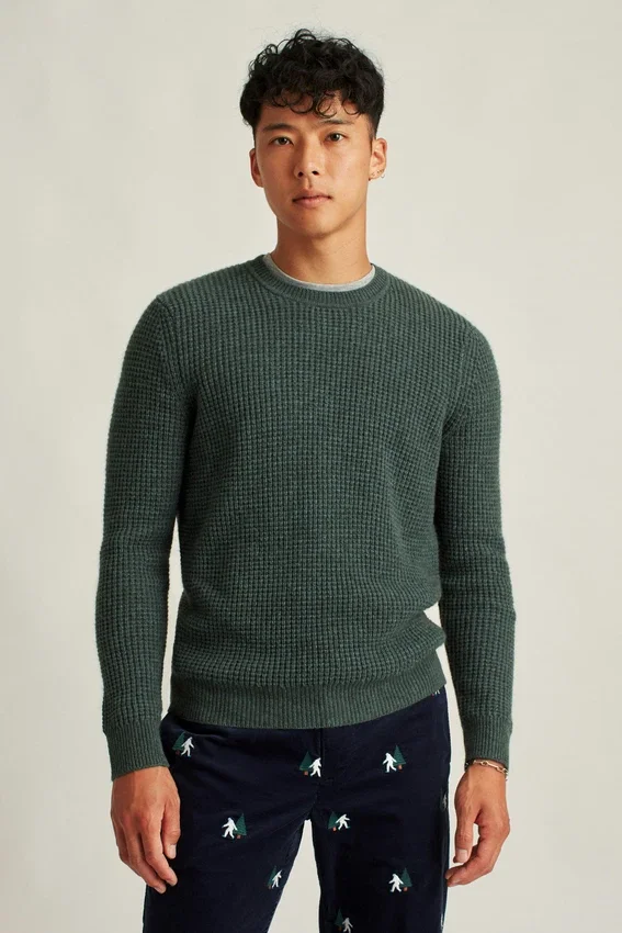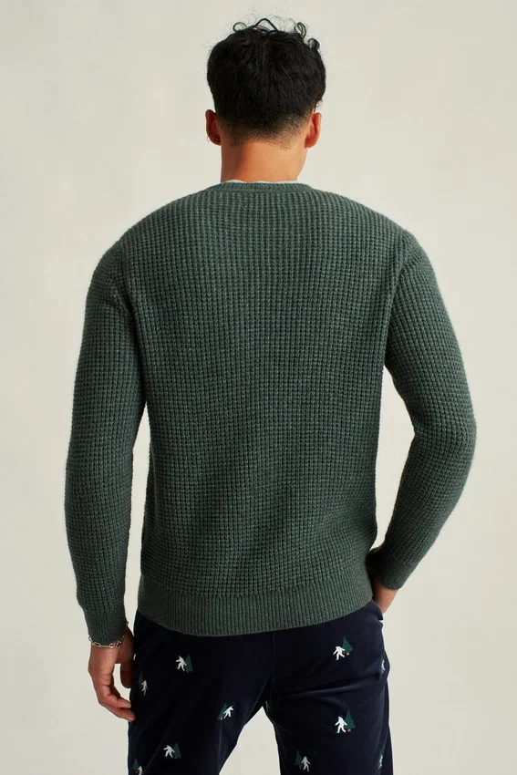 Mezcla suave, cálida y lujosa de lana de yak y merino. Peso medio. Cuerpo con punto waffle térmico. Ribetes acanalados