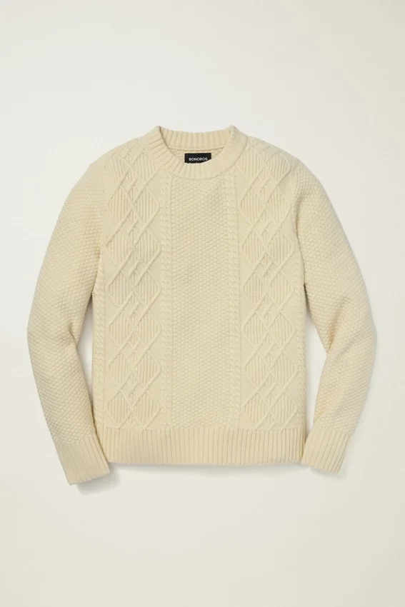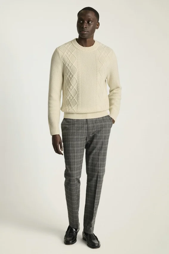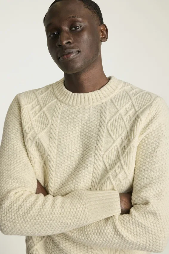 Hilo de mezcla de merino | Punto trenzado en toda la prenda | Tacto grueso | Ribetes acanalados