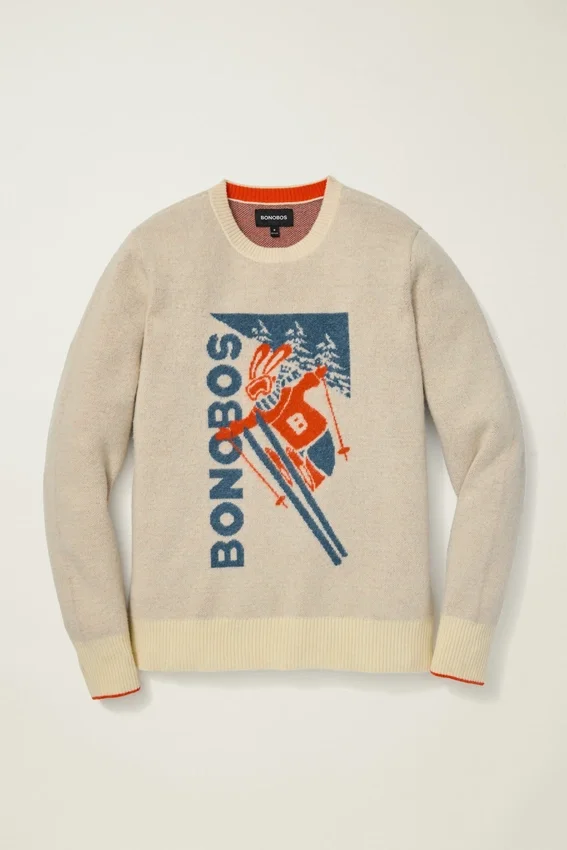 Ponte cómodo con nuestro suéter Ski Bunny de merino extrafino, inspirado en los carteles retro. Perfecto para el estilo après-ski, incluso si no vas a las pistas.