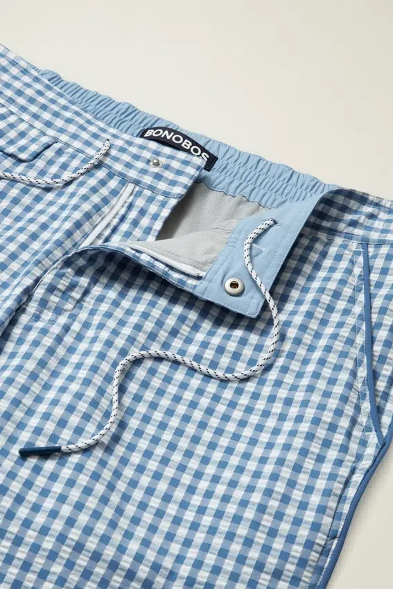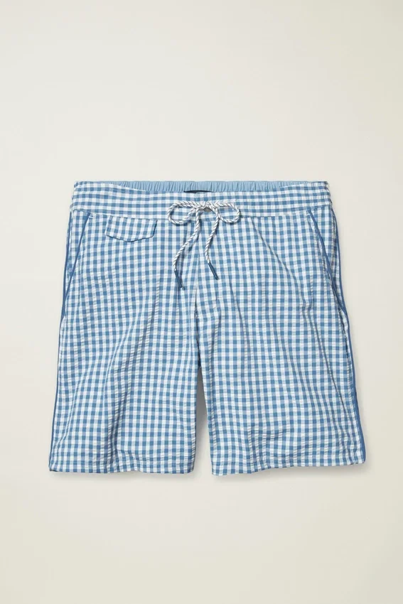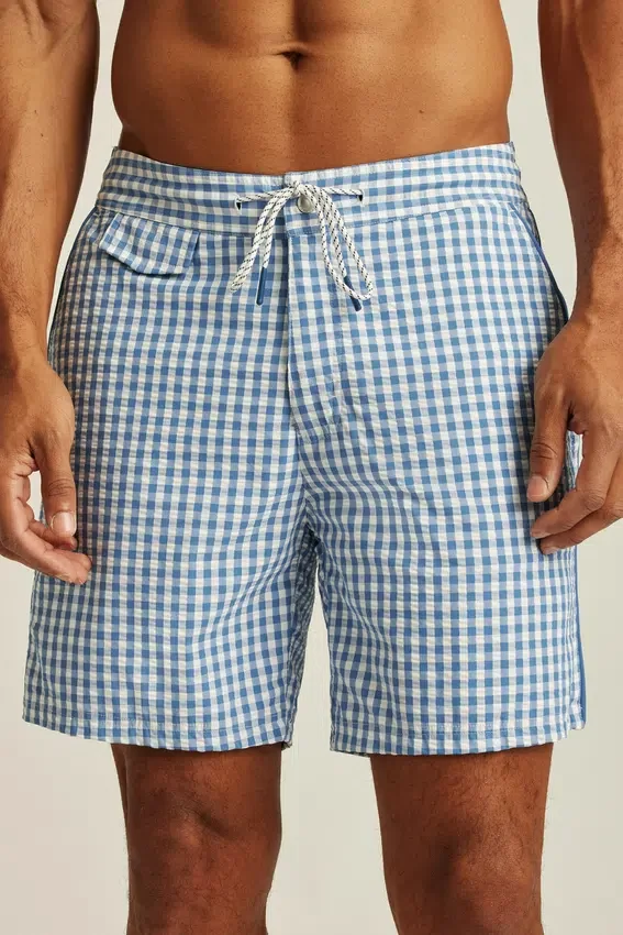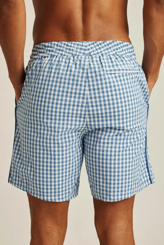 Bañador de seersucker con estilo y funcionalidad tanto para la playa como para el paseo marítimo.