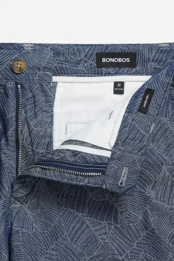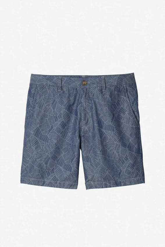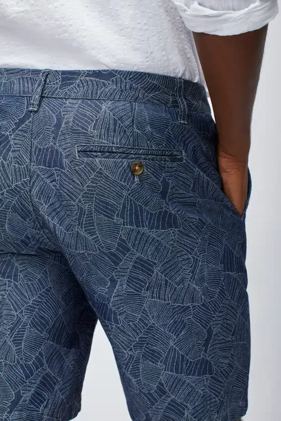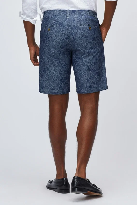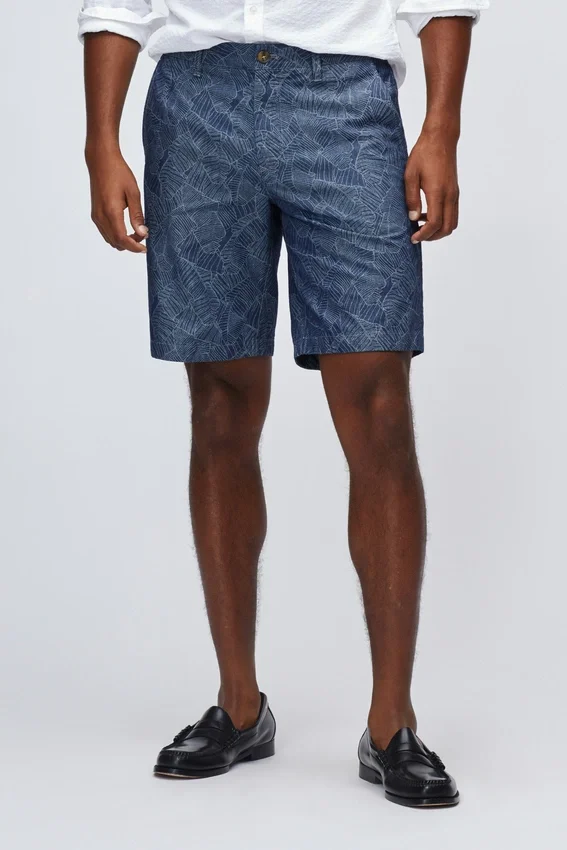 Pantalón corto chino de algodón elástico estampado | Curved Waistband característica | Cierre con botón en el centro delantero | Bolsillos traseros con ribete y cierre de botón.