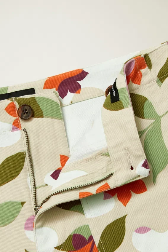 Lona de algodón estampada | Bolsillos de parche delanteros | Bolsillos de parche traseros con solapas | Cierre de botones