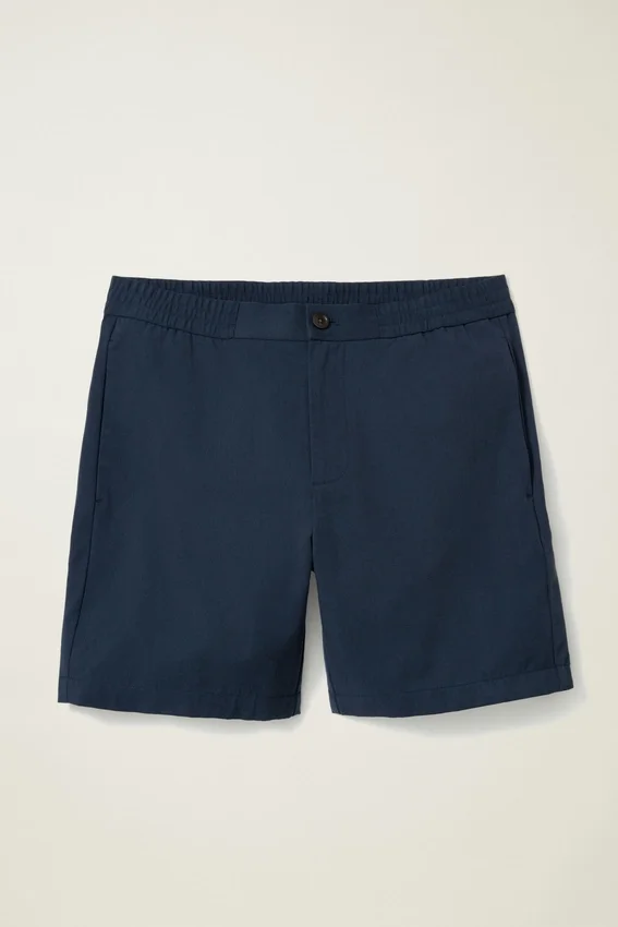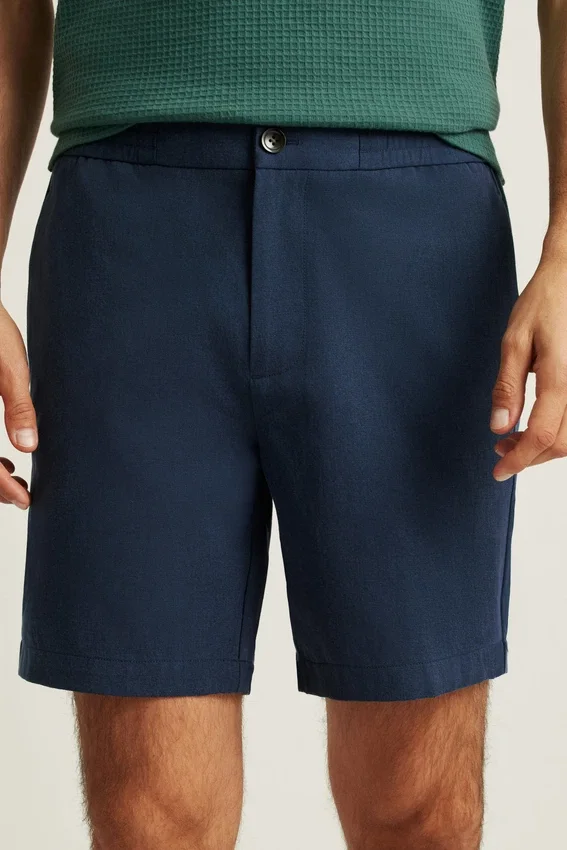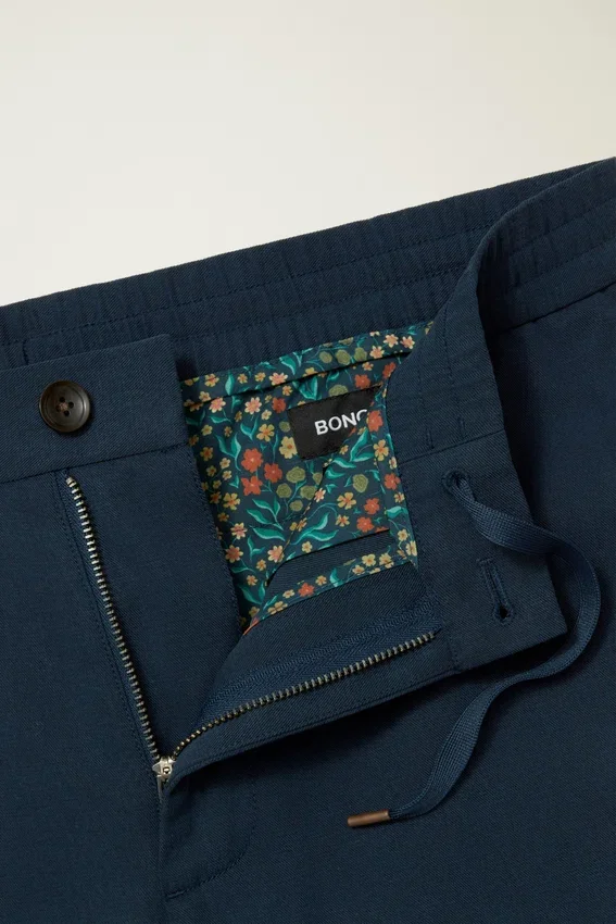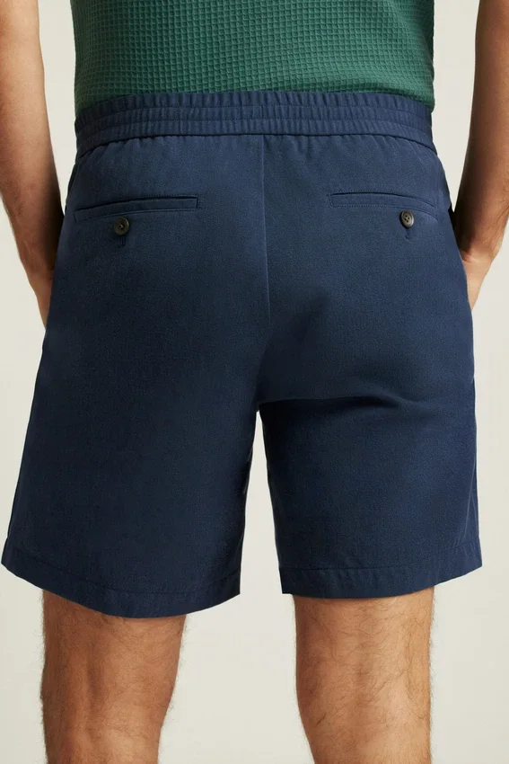 Cintura elástica híbrida | Tejido mezcla de Tencel y algodón | Cordón interior de punto liso | Cierre frontal con botones | Bolsillos traseros con ribete y cierre de botón