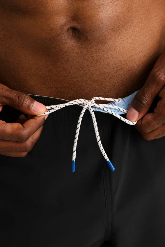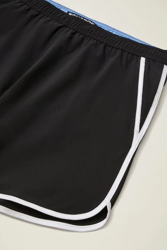 Borde curvo con abertura, inspirado en el surf vintage: bajo curvo con abertura, ribete del mismo tejido y bordado | Cintura elástica con cordón interior | Forro interior de malla | Bolsillos delanteros con ribete | Bolsillo trasero con cremallera | Contraste en la cintura interior y en el gancho para llaves