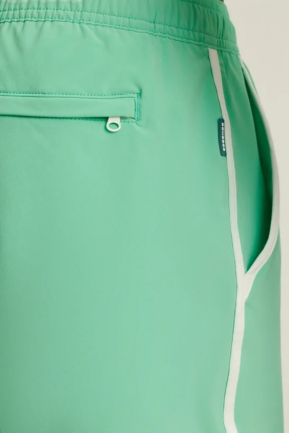 Borde curvo con abertura, inspirado en el surf vintage: bajo curvo con abertura, ribete del mismo tejido y bordado | Cintura elástica con cordón interior | Forro interior de malla | Bolsillos delanteros con ribete | Bolsillo trasero con cremallera | Contraste en la cintura interior y en el gancho para llaves