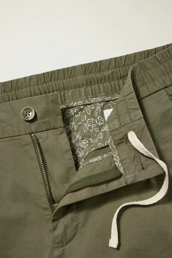 Cordón interior natural | Cierre con botones | Bolsillos estampados | Bolsillos traseros con ribete