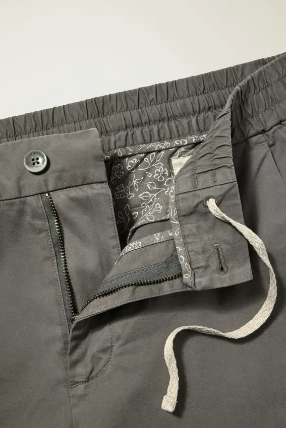 Cordón interior natural | Cierre con botones | Bolsillos estampados | Bolsillos traseros con ribete
