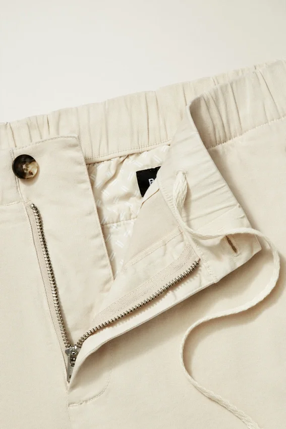 Cintura elástica con cordón interior | Teñido en prenda para un aspecto desgastado y un tacto suave | Bragueta con cremallera y cierre de botón | Refuerzo en la entrepierna para facilitar el movimiento | Bolsillos estampados | Cierre de botón en los bolsillos traseros