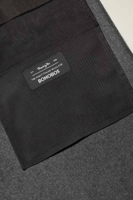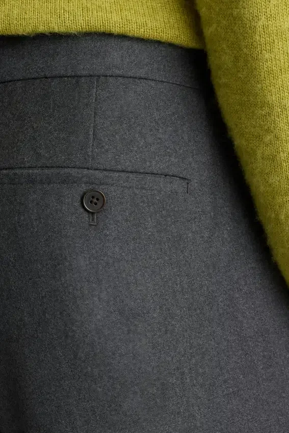 Flanela de lana italiana de primera calidad con elegantes pliegues que aportan sofisticación de mediados de siglo.