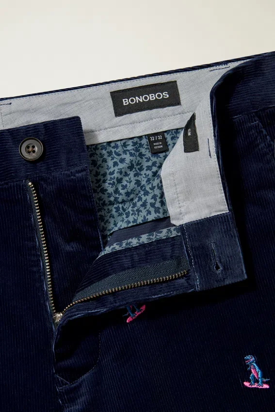 Tejido de pana de lujo fabricado en Italia | Peso para todo el año | Cintura contorneada característica con cortina interior | Cierre frontal con lengüeta extensible y botón | Bolsillos traseros ribeteados con botones | Muesca en el centro de la espalda
